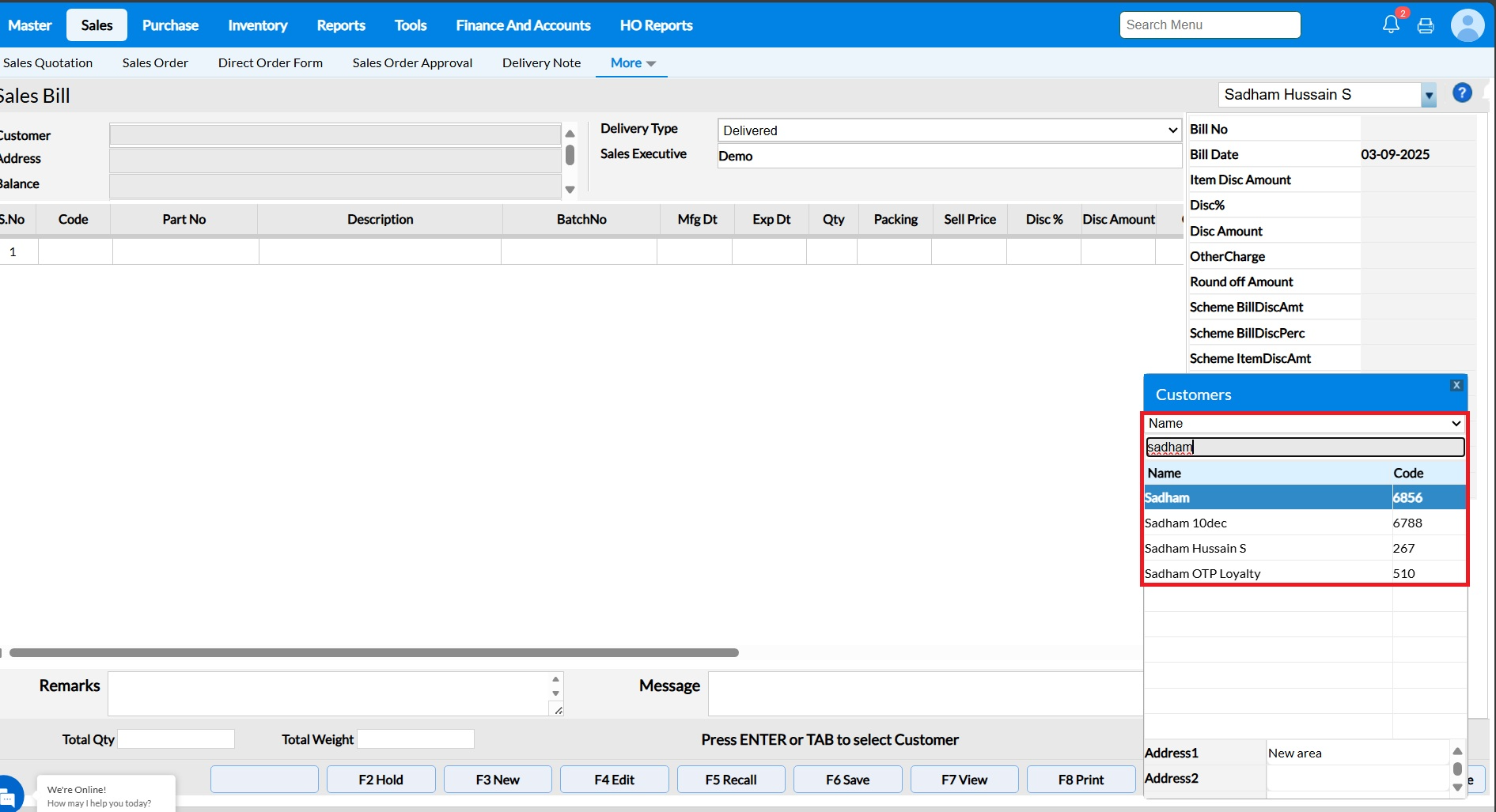 1. Select the Customer Name or press ENTER or Customer and select from Customers pop-up screen.
