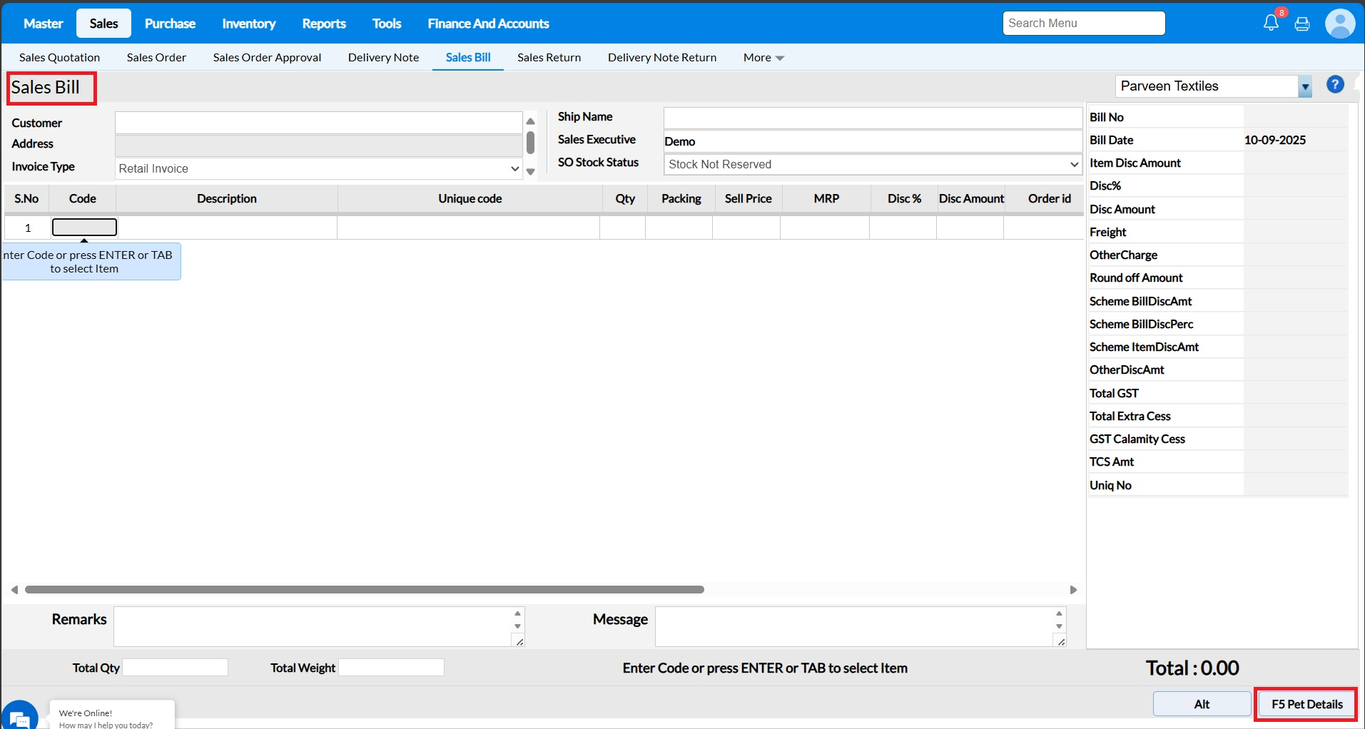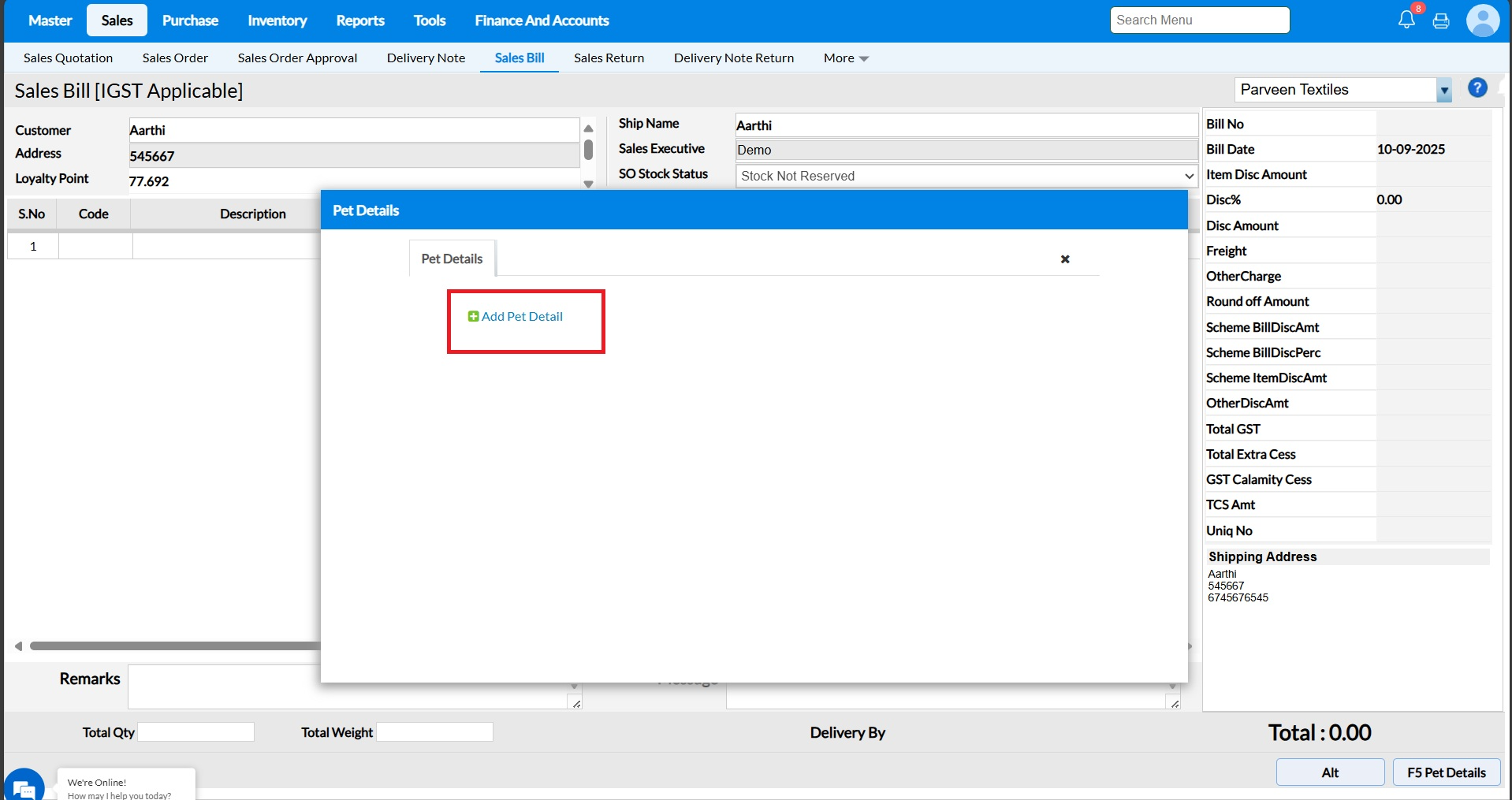 1. Go to Sales->Sales bill->Press Alt+F5 to enter the details of Pet