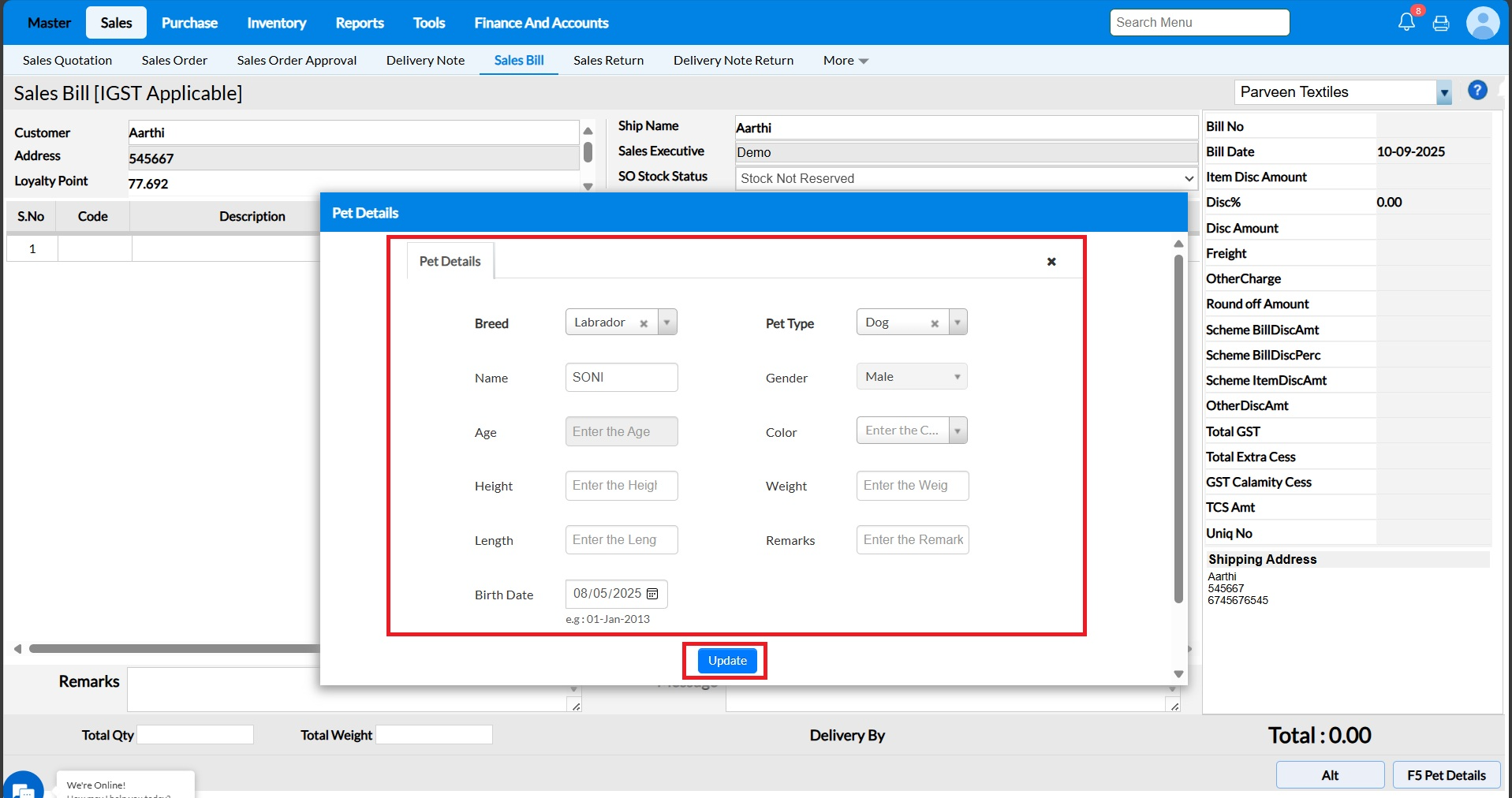 4. Once the Sales bill were saved , The pet details added against the customer will be saved.
