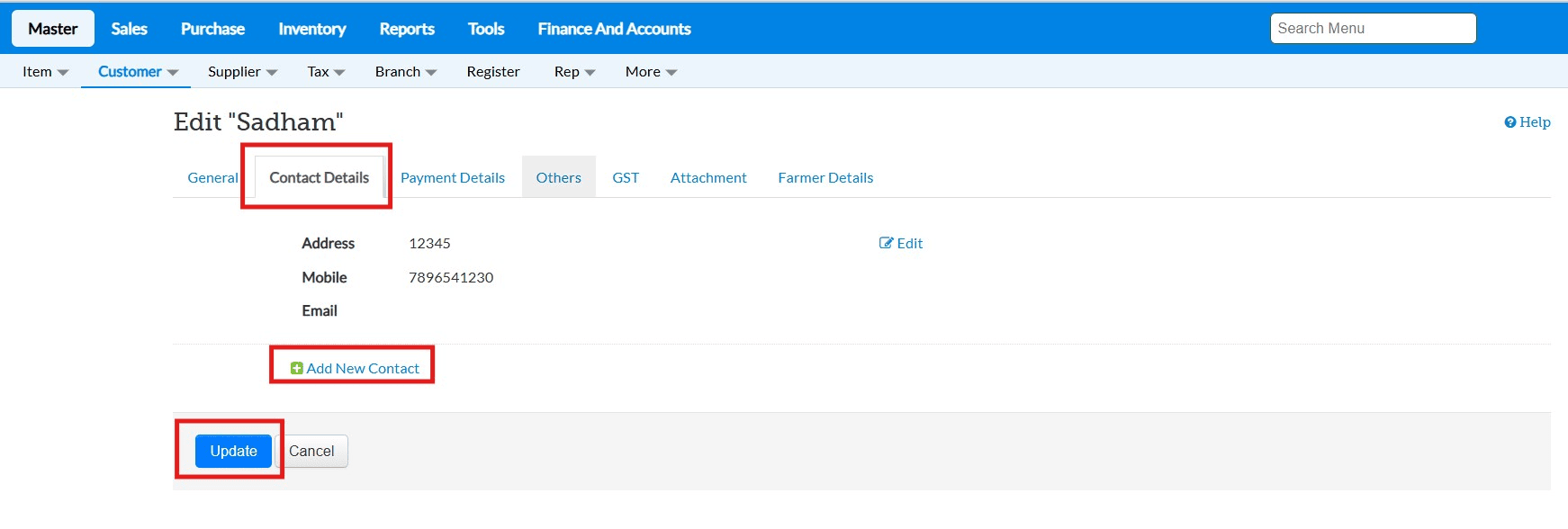 1.Go to Master → Customer Master → Edit the respective customer and navigate to 'Contact Details'