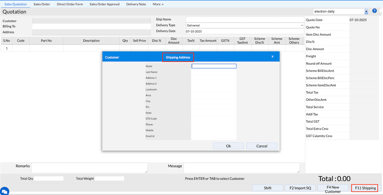 3. You can also use the 'Shipping' in the Sales Quotation screen by pressing 'Shift+F11' and add the additional shipping address.