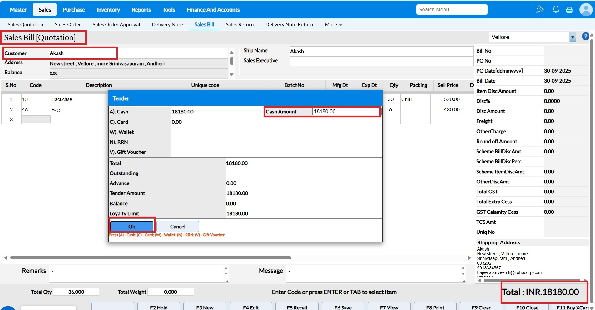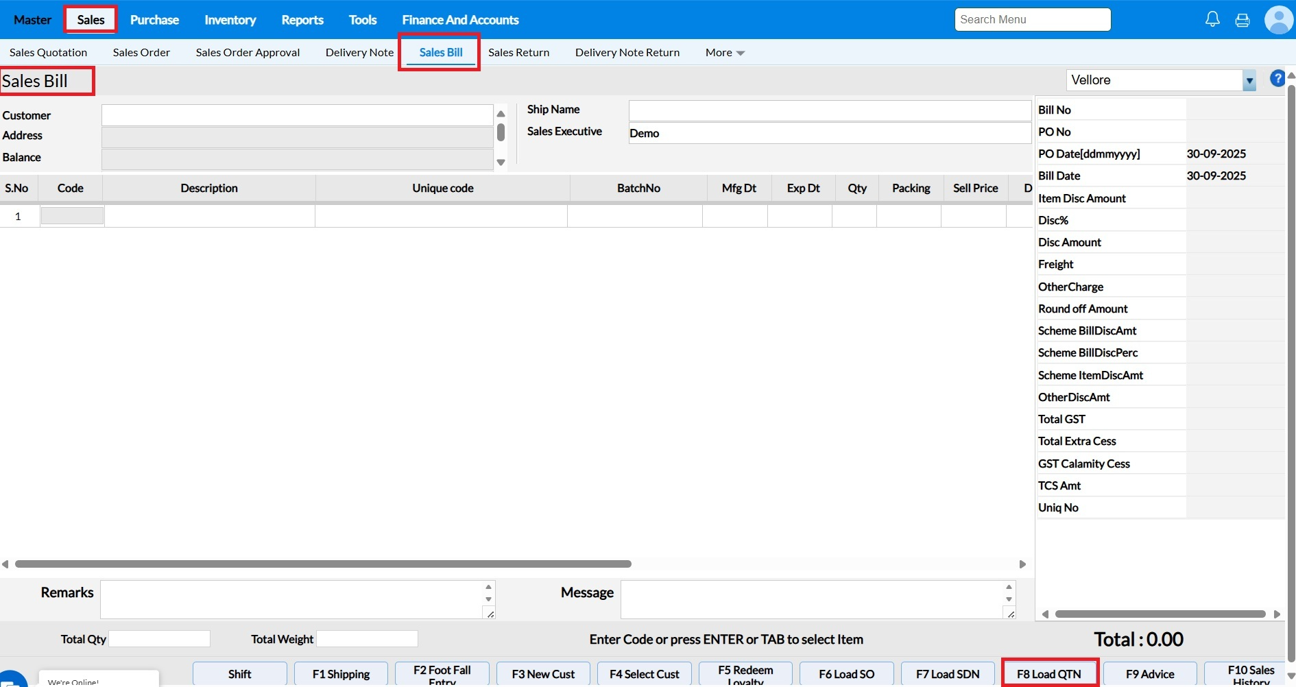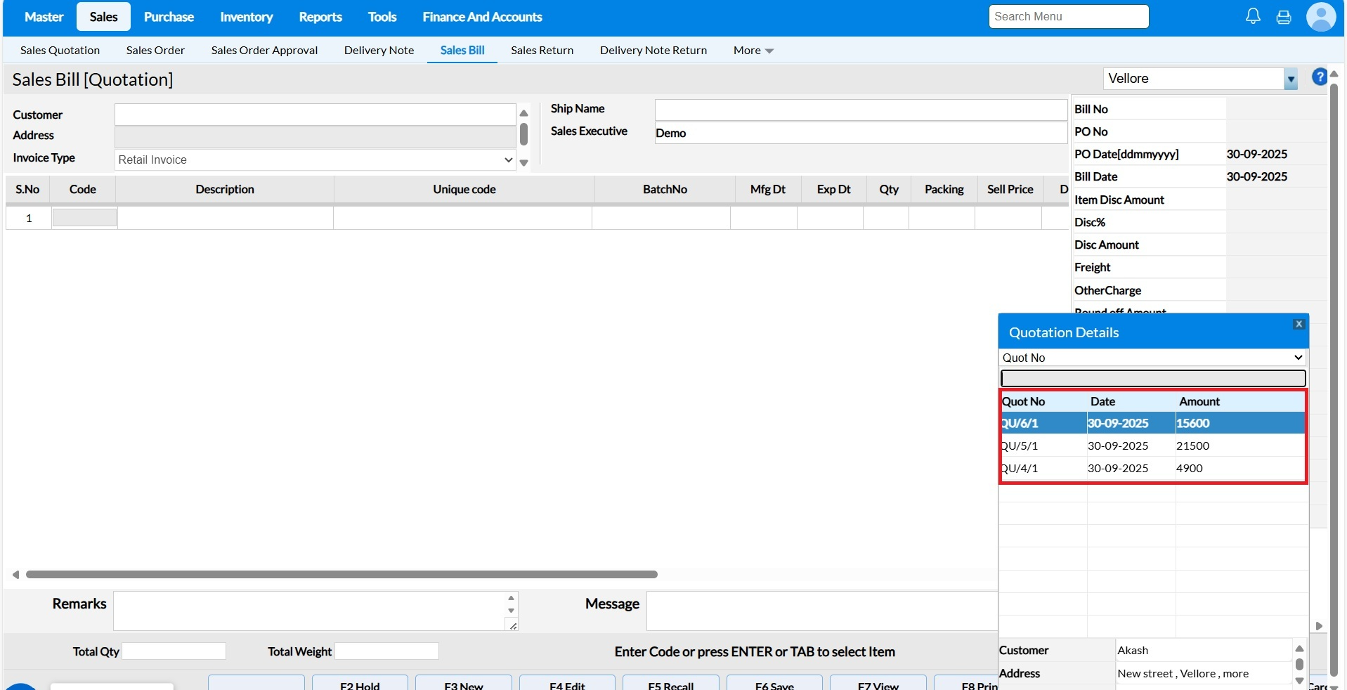 Select a Quot No from the pop-up for Sales Bill generation.