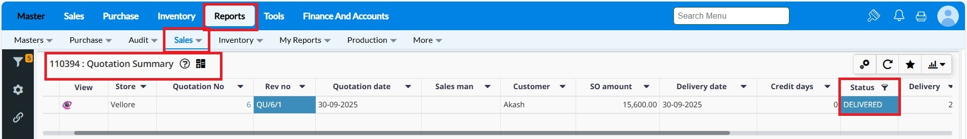 3. Reports: Go to Reports ->Sales ->Orders and Quotation -> Quotation Summary