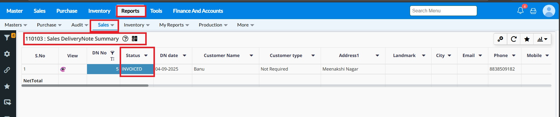 7.After converting, the Delivery Note status becomes 'INVOICED'
