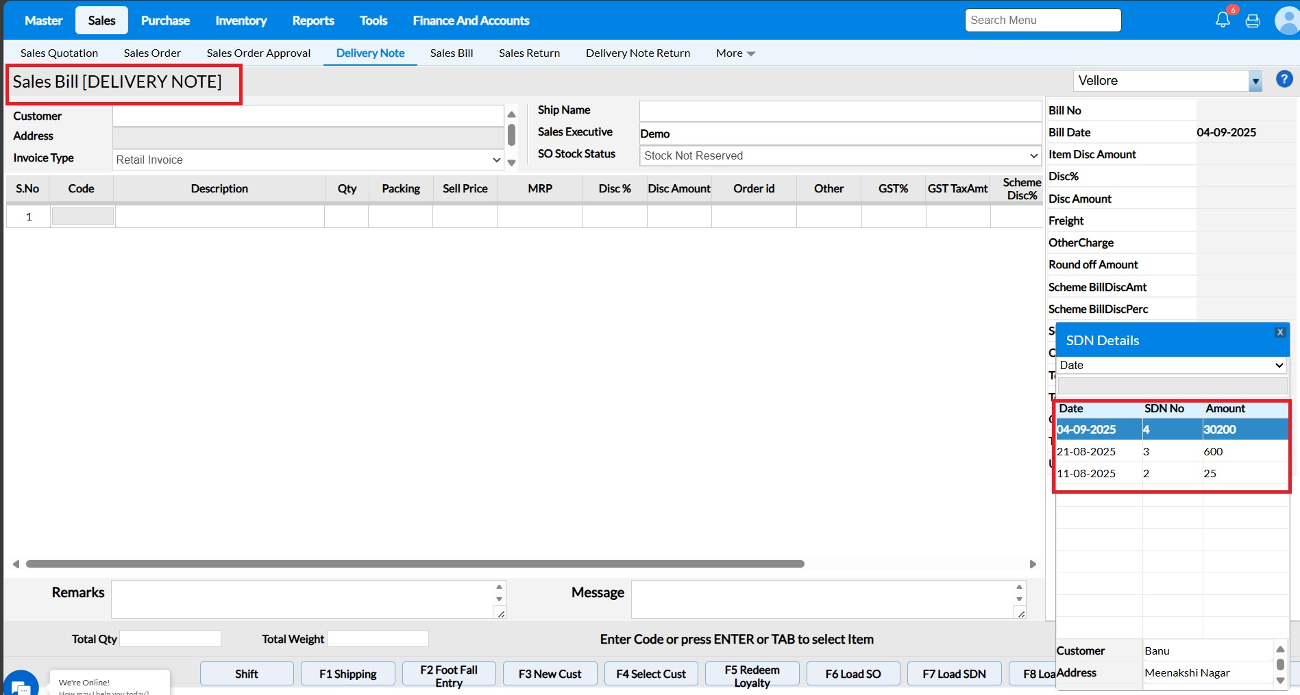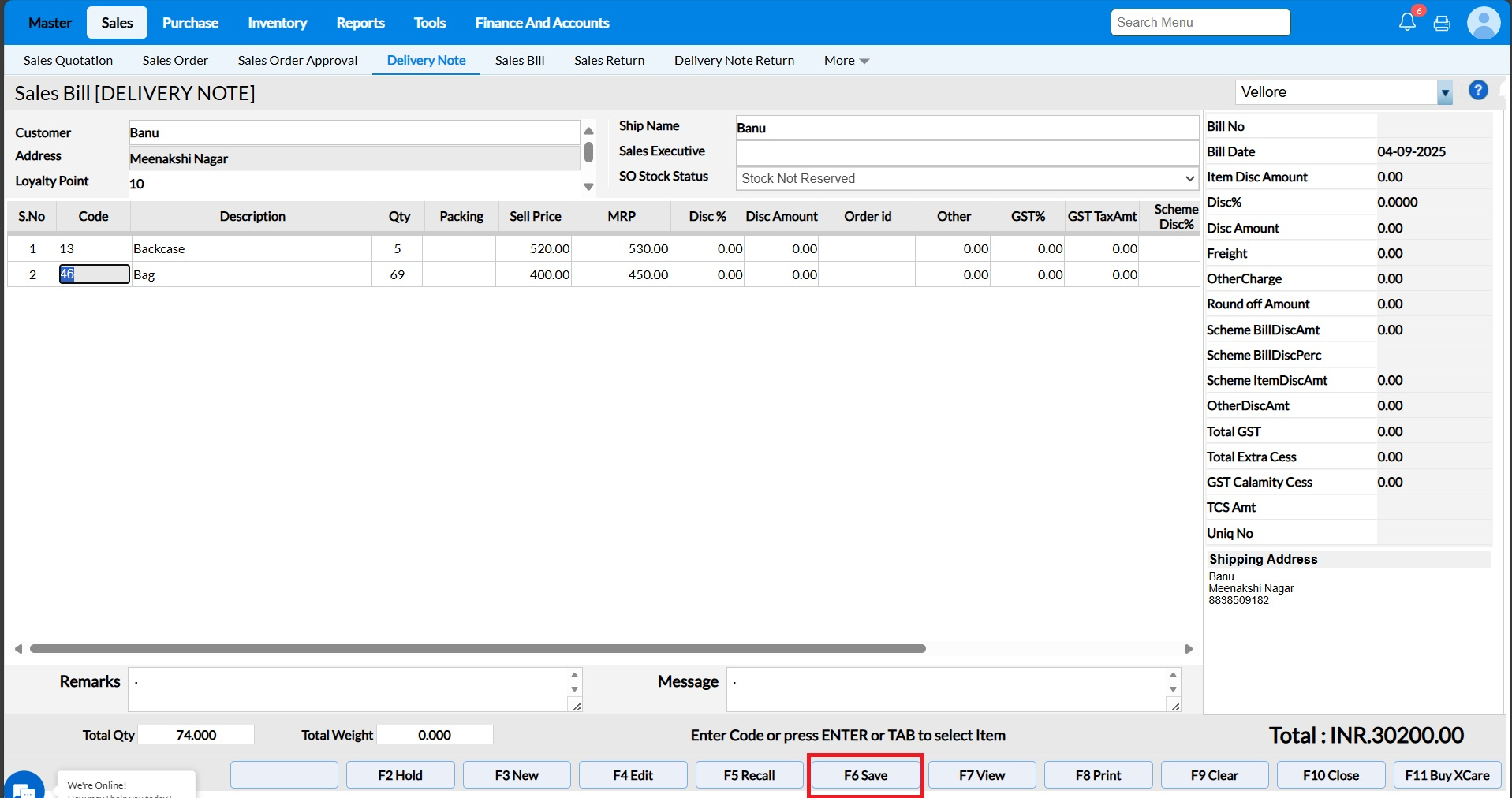 4.The details of the selected delivery note appears in the grid.Press F6 or click "Save".