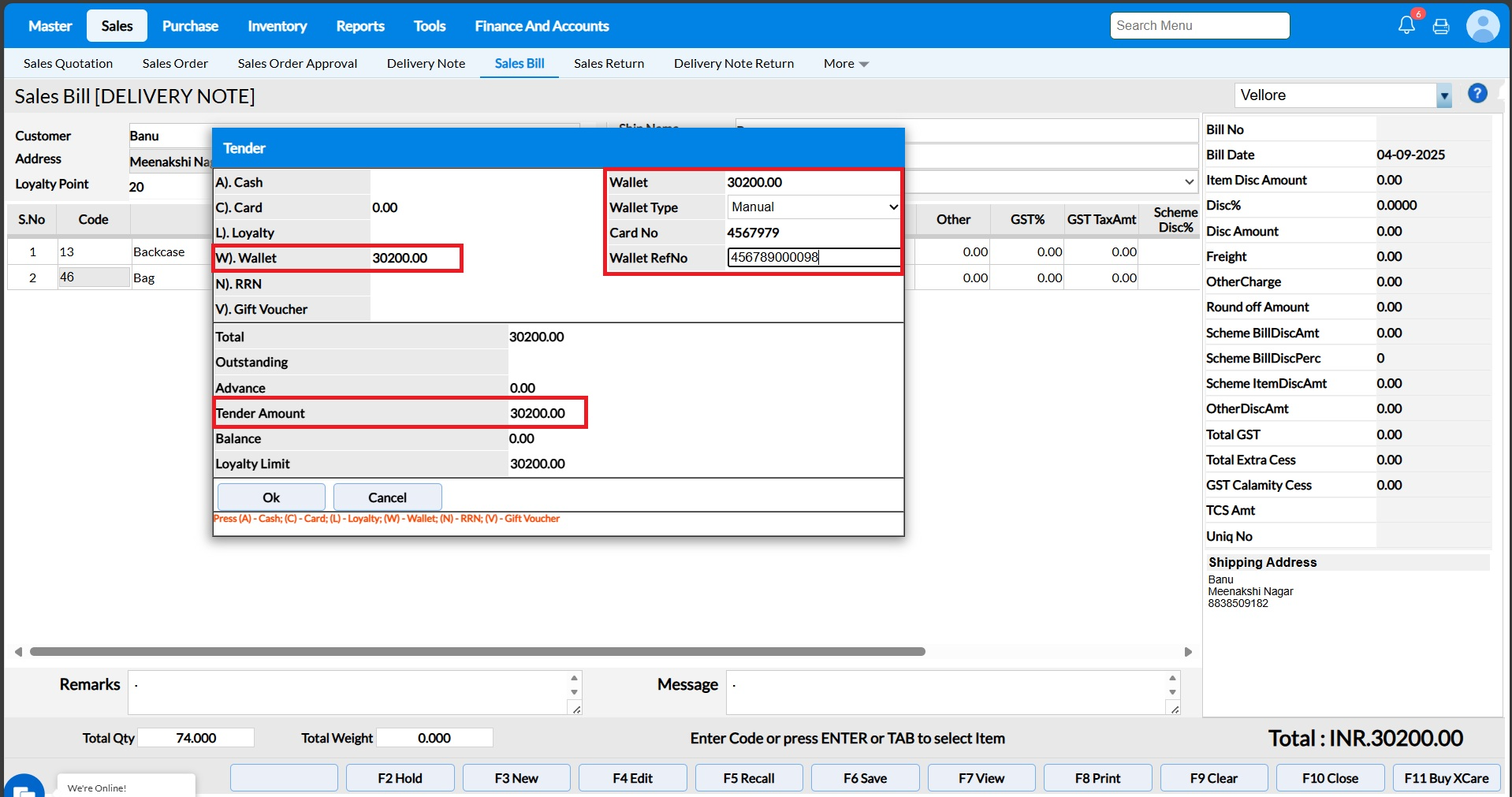 5.Payment Tender screen appears with the default payment option as 'Cash'.