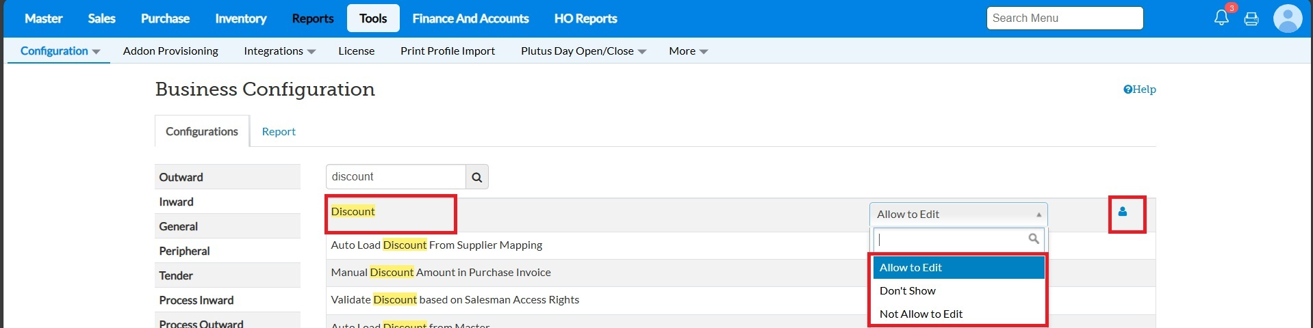 Click Tools > Configurations > Business Configurations > Outward > Enable Discount Checkbox.