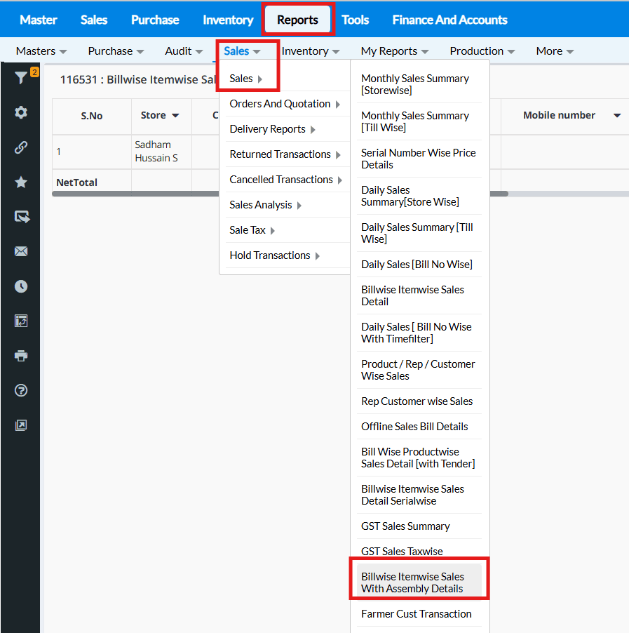 Kindly go to the path "Reports --> Sales --> Sales --> Billwise Itemwise Sales With Assembly Details (Report ID : 116531)" --> Select the respective date range and location and fetch the reports.
