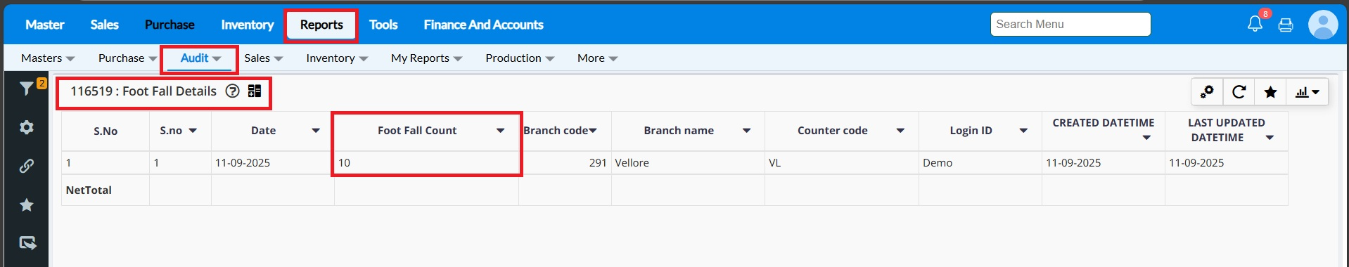 Step 3: The Footfall entries will be registered as per the date , Once Bill get saved.