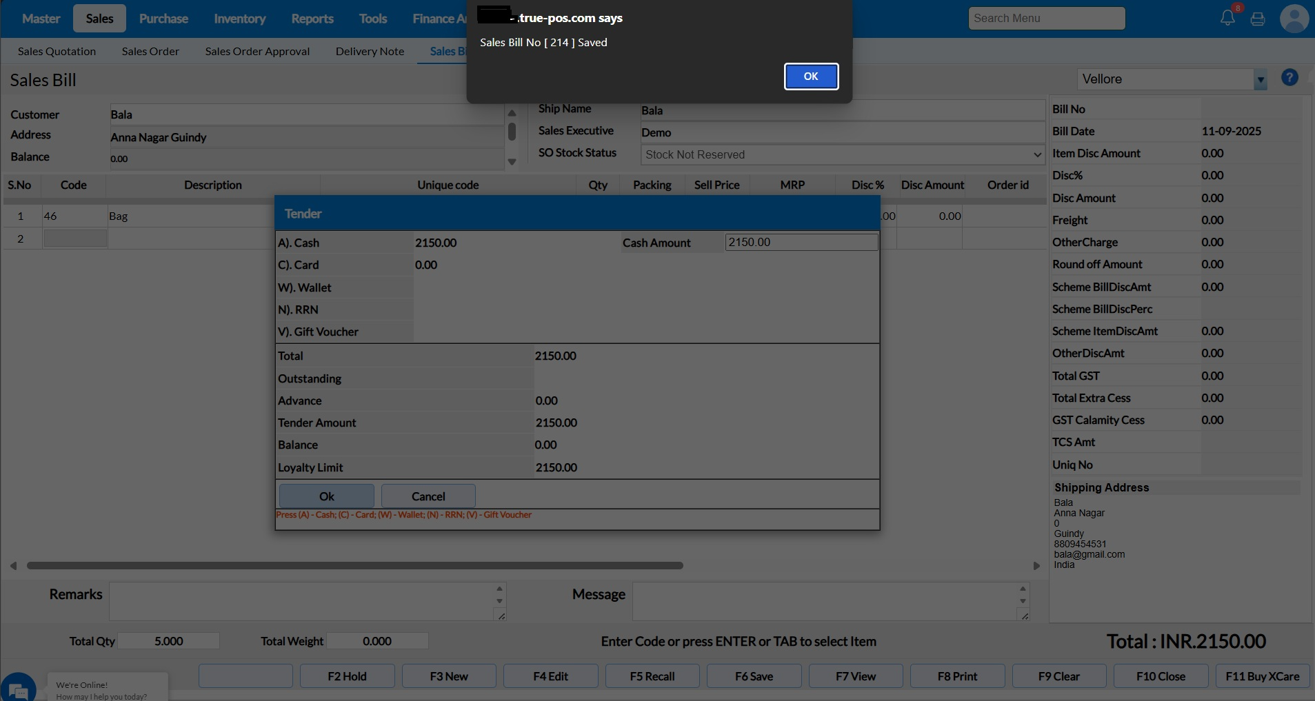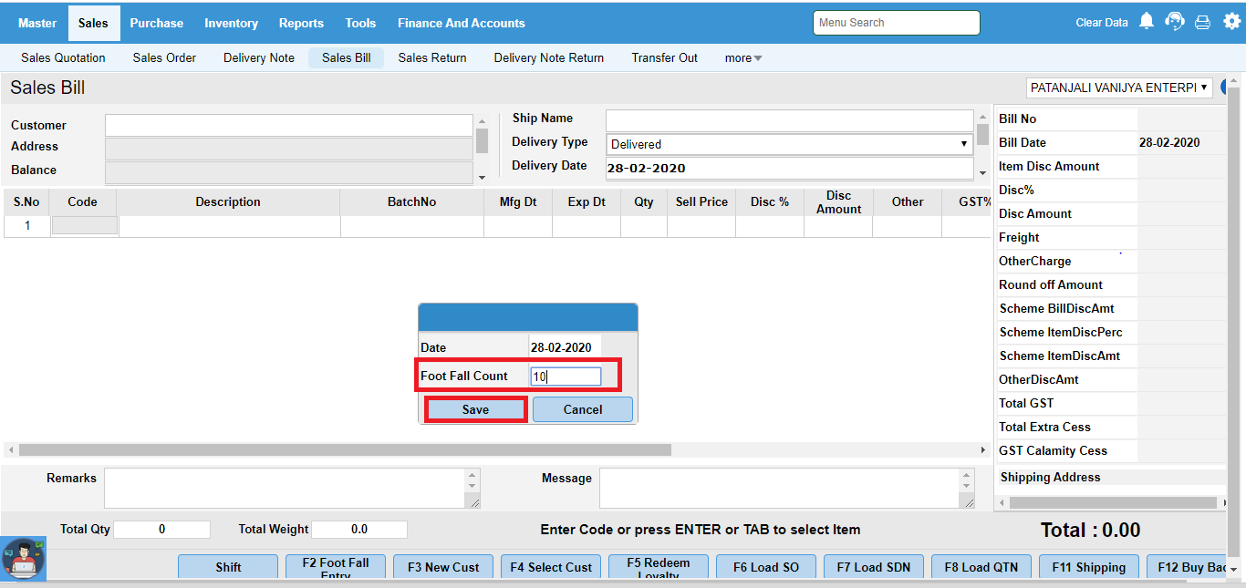 1: Go to Sales->Sales bill->Press Shift+F2 to make a footfall entry