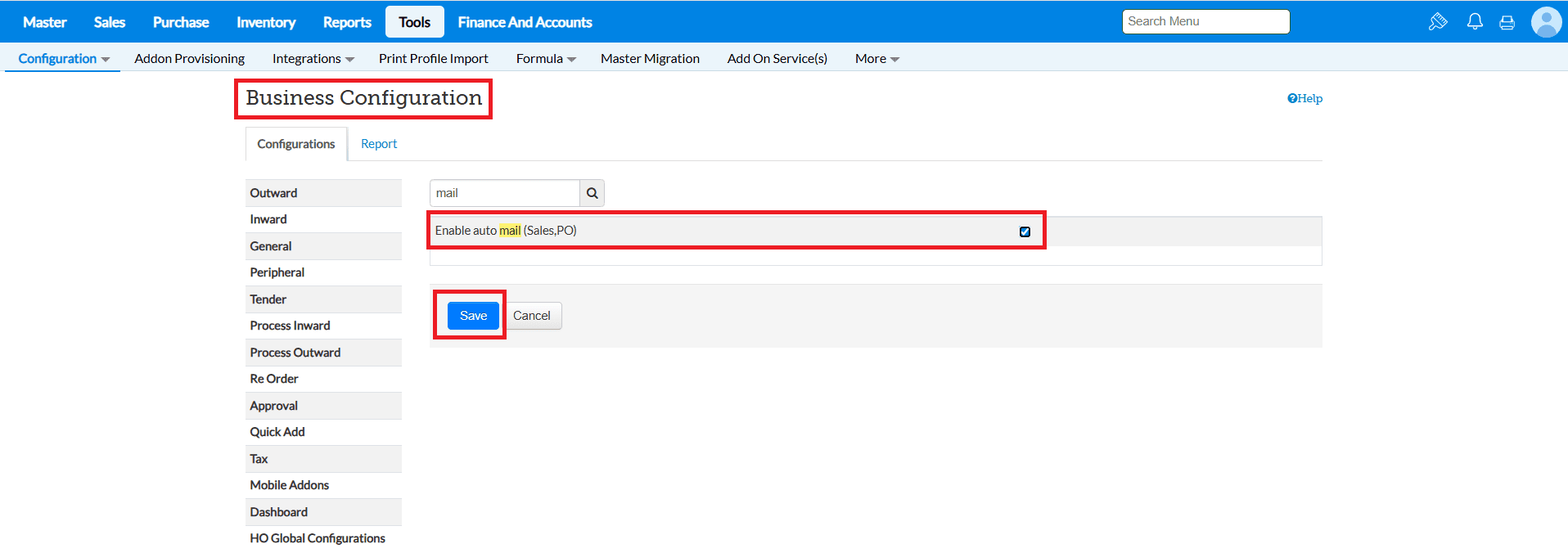 5.Search with auto mail and click on Enable auto mail (Sales,PO) and click on Save button.