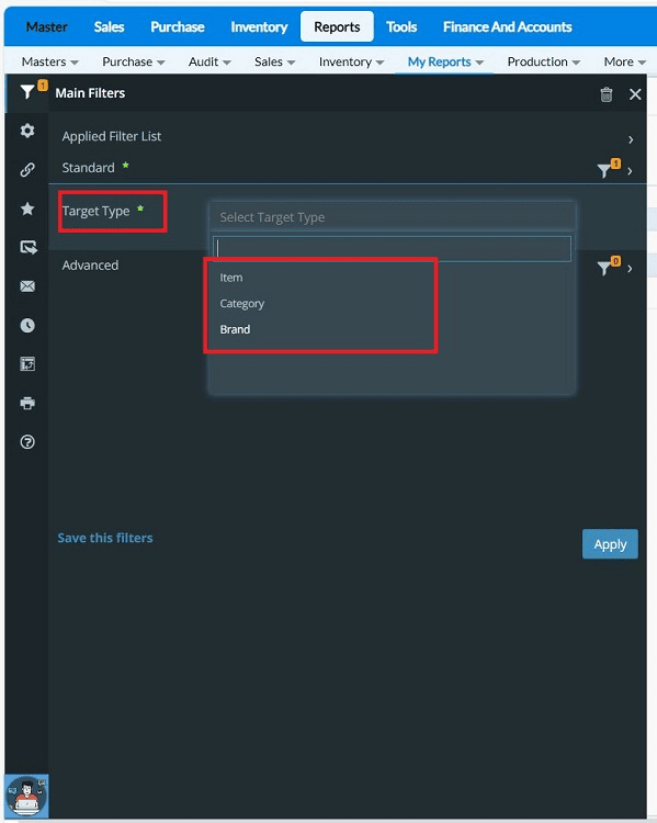 8.The Reports can be fetched based on the "Target Type" Category /Item/ Brand.Now you can verify the Sales Target details in Reports.