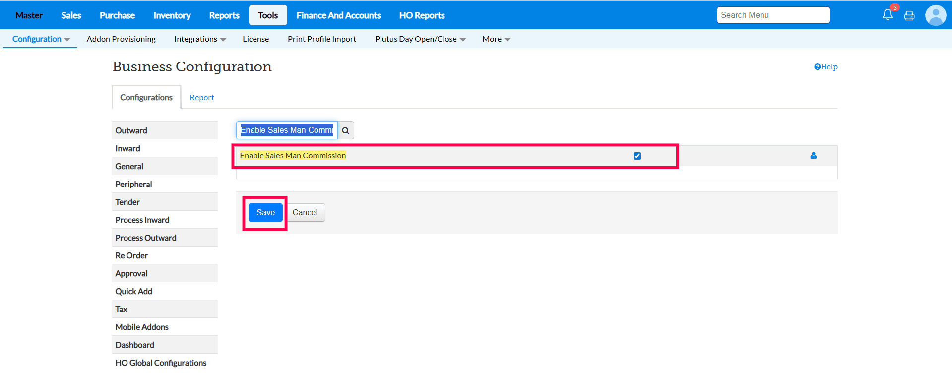 Prerequisites :- Enable the configuration " Enable Sales man Commission" in Tools -> Configuration -> Business Configuration and Search ( Enable Sales Man Commission )and enable the configuration and click Save to save the changes made.