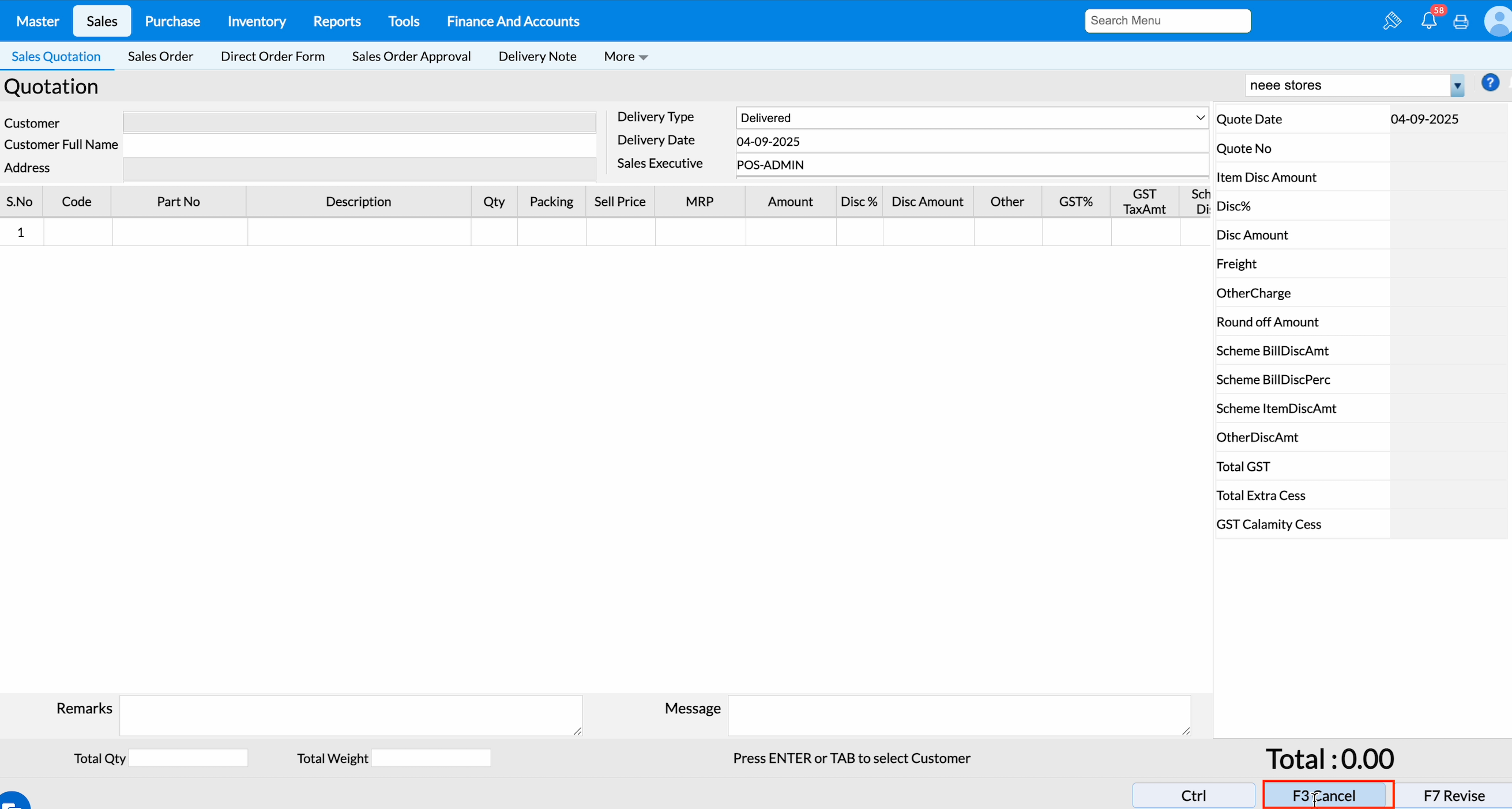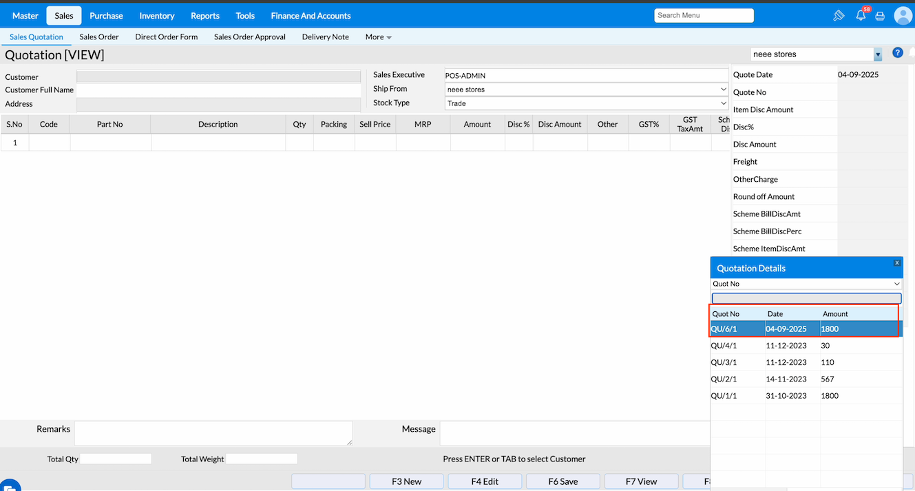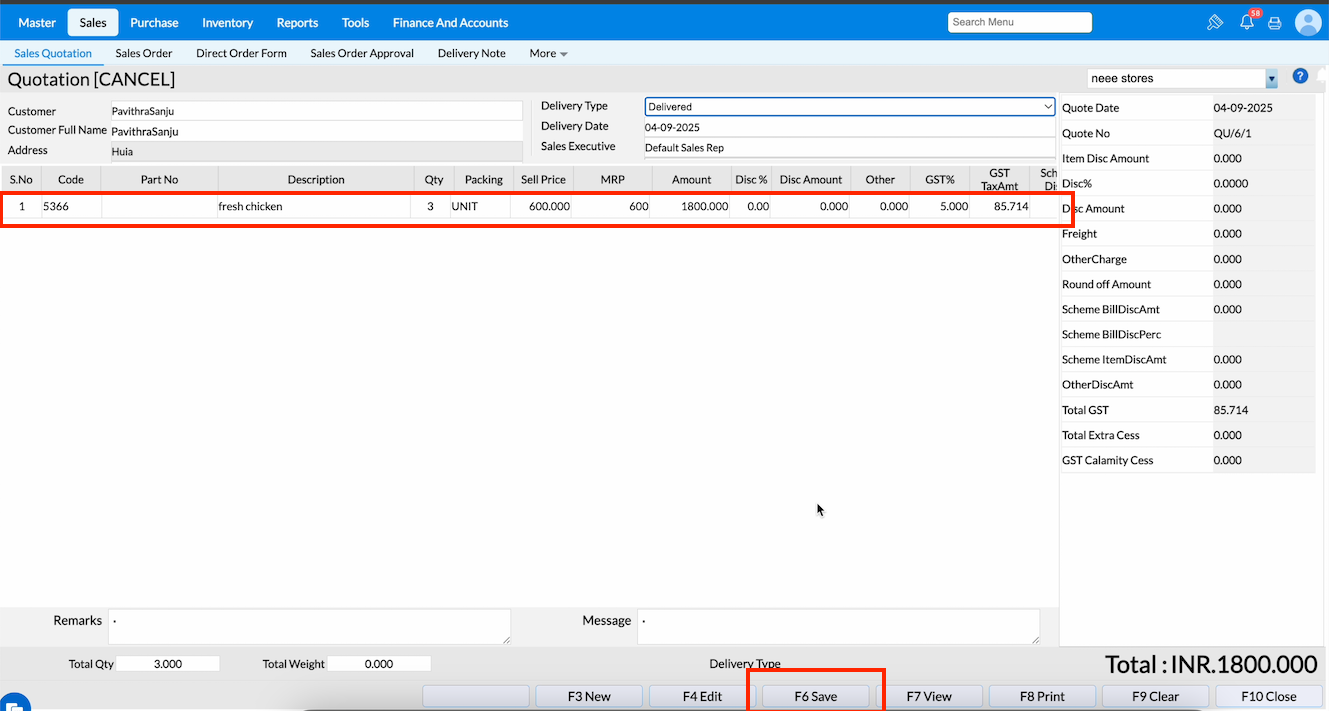 Press F6 or click Save to cancel the sales quotation.