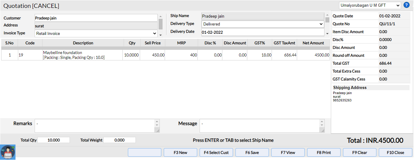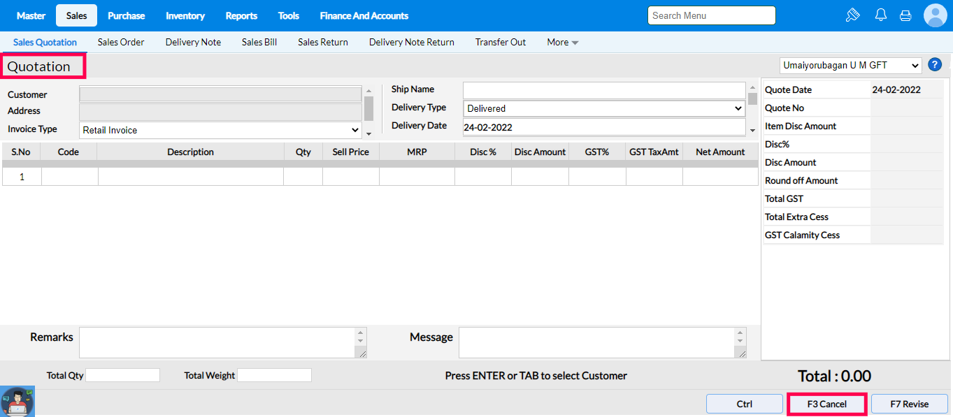 Step 4: The selected Quotation will be loaded to the Quotation [CANCEL] screen
