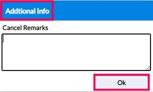 Step 5: Click on Save or press the corresponding function key (F6 by default) to Cancel. The Additional Info pop-up appears for remarks, type in the details for the cancellation and click Ok