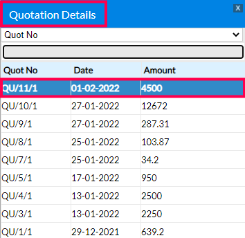 Step 3: From the Quotation Details pop-up, select the Quotation that you'd want to Cancel and press Enter