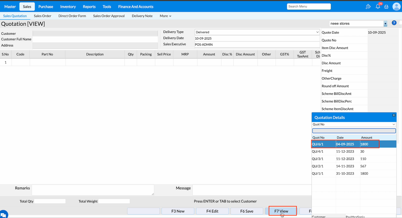 The Quotation screen displays the details of the selected Quote in [VIEW] mode