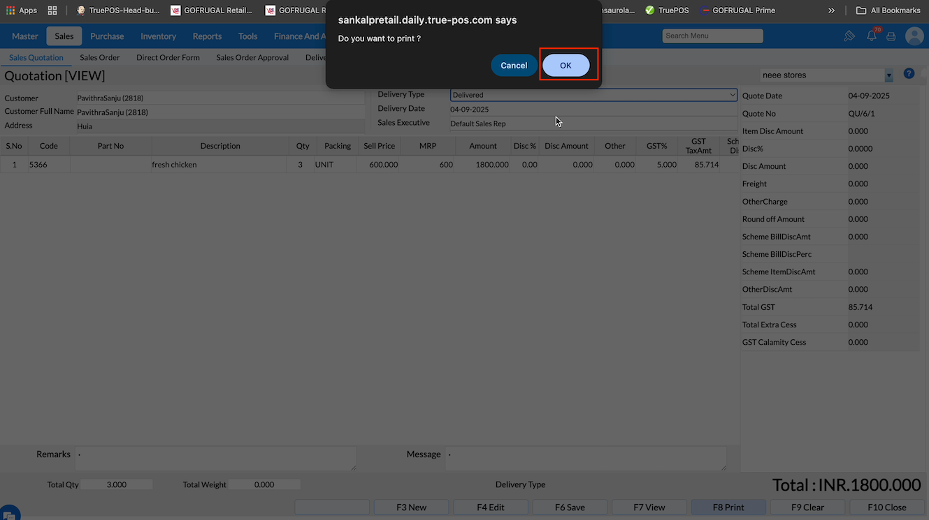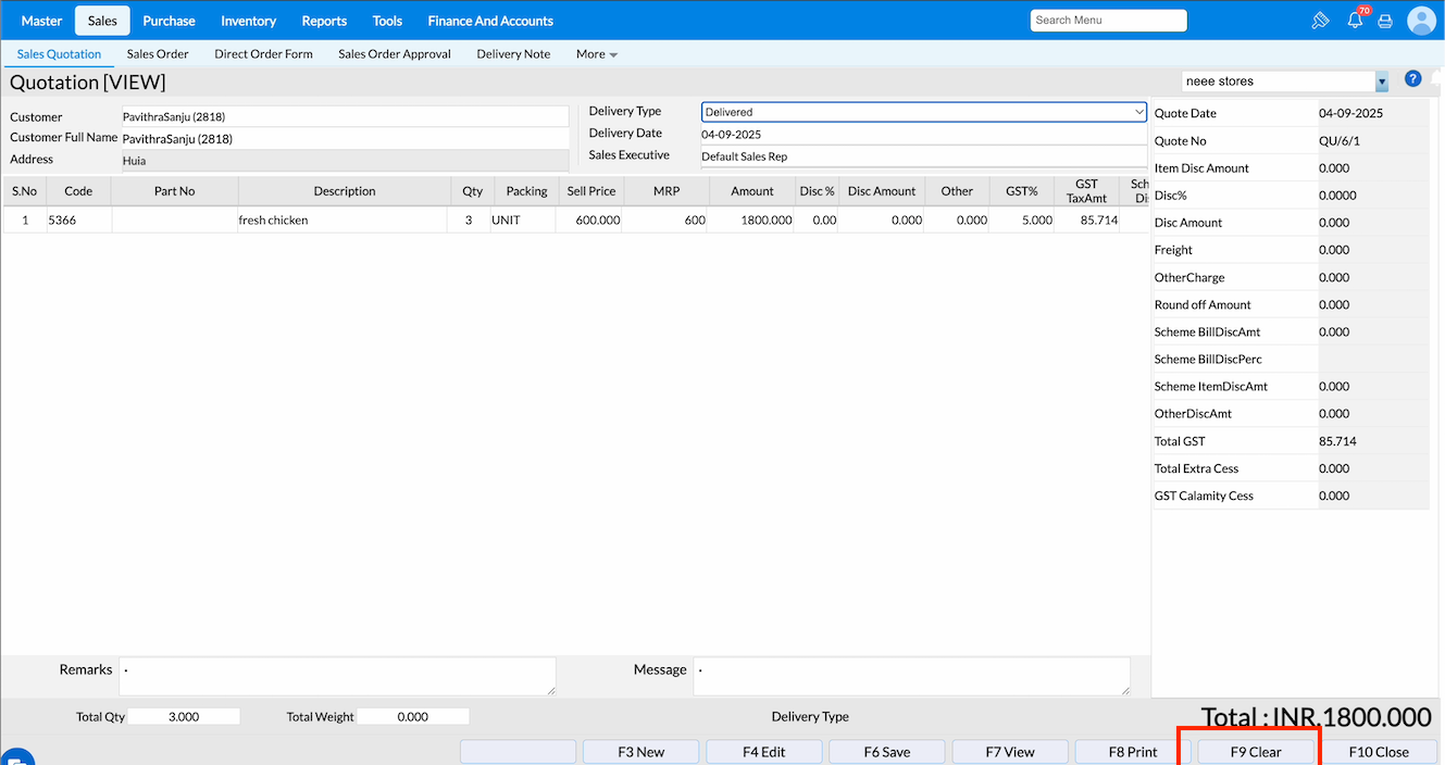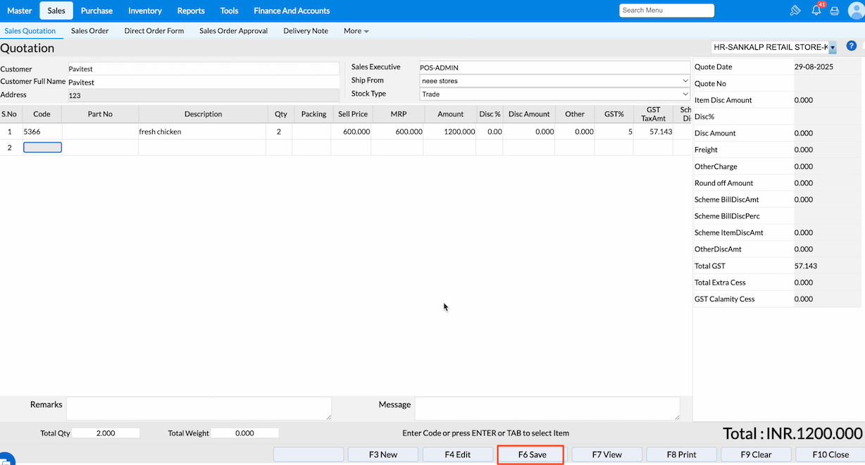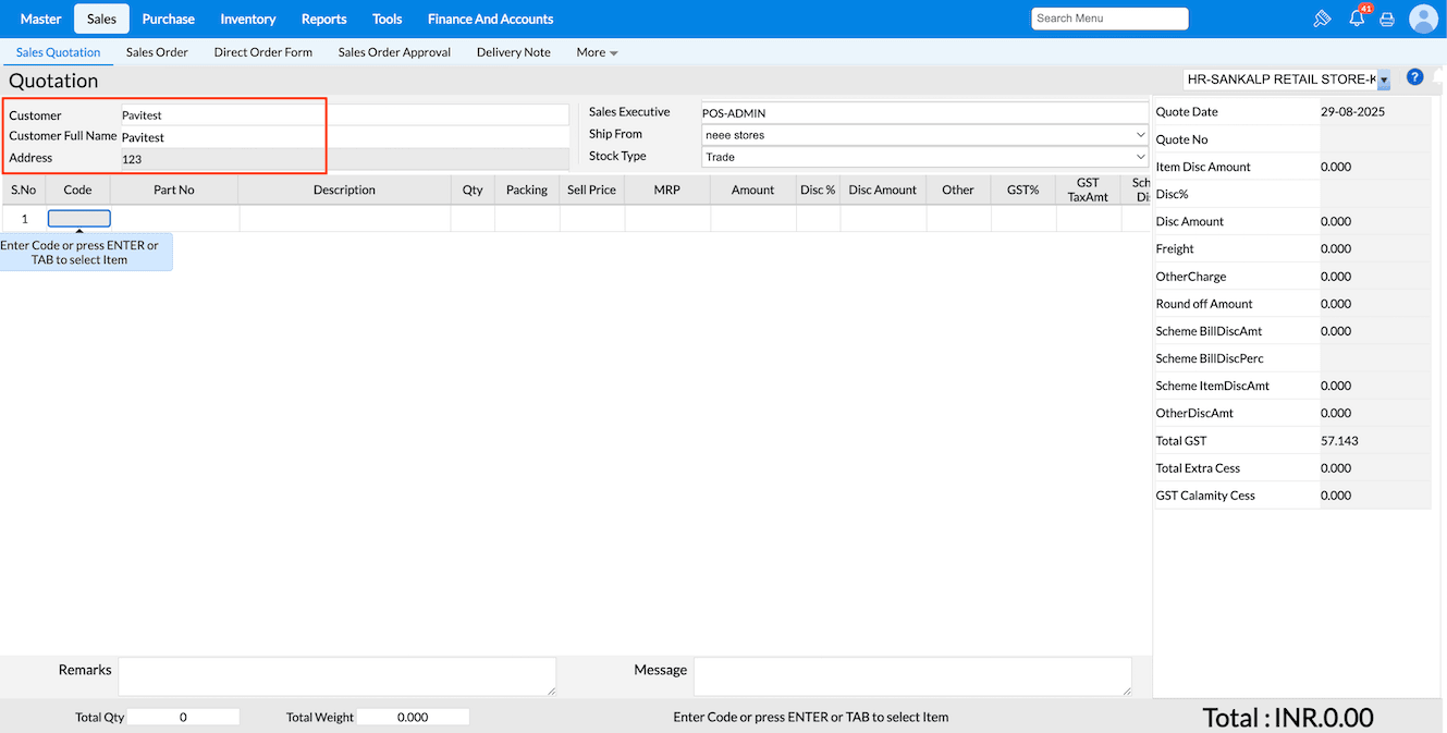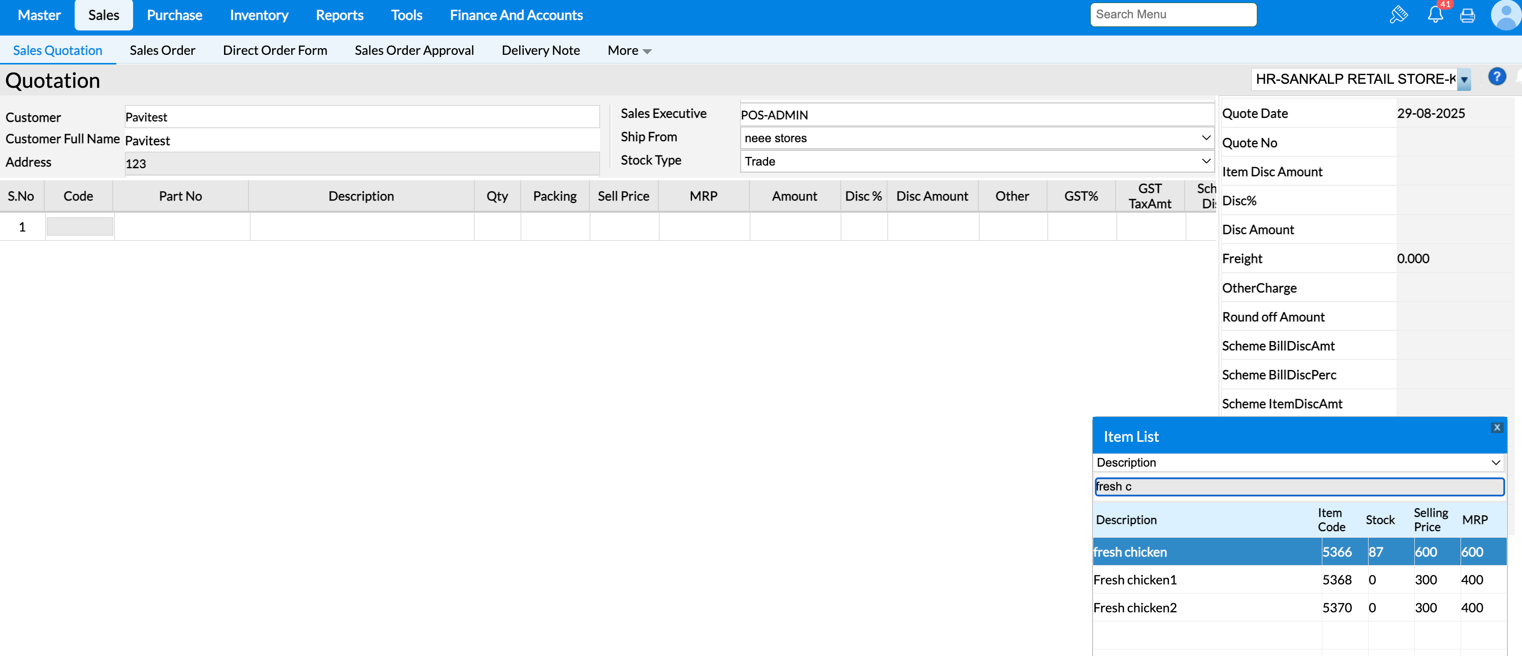 Purpose – A Sales Quotation in POS is a provisional document that gives customers an estimated cost of items before purchase. For example, if a customer requests a quotation for monthly groceries worth ₹5,000, the system generates a quotation that can later be converted into a Sales Order or Sales Bill once the customer confirms.