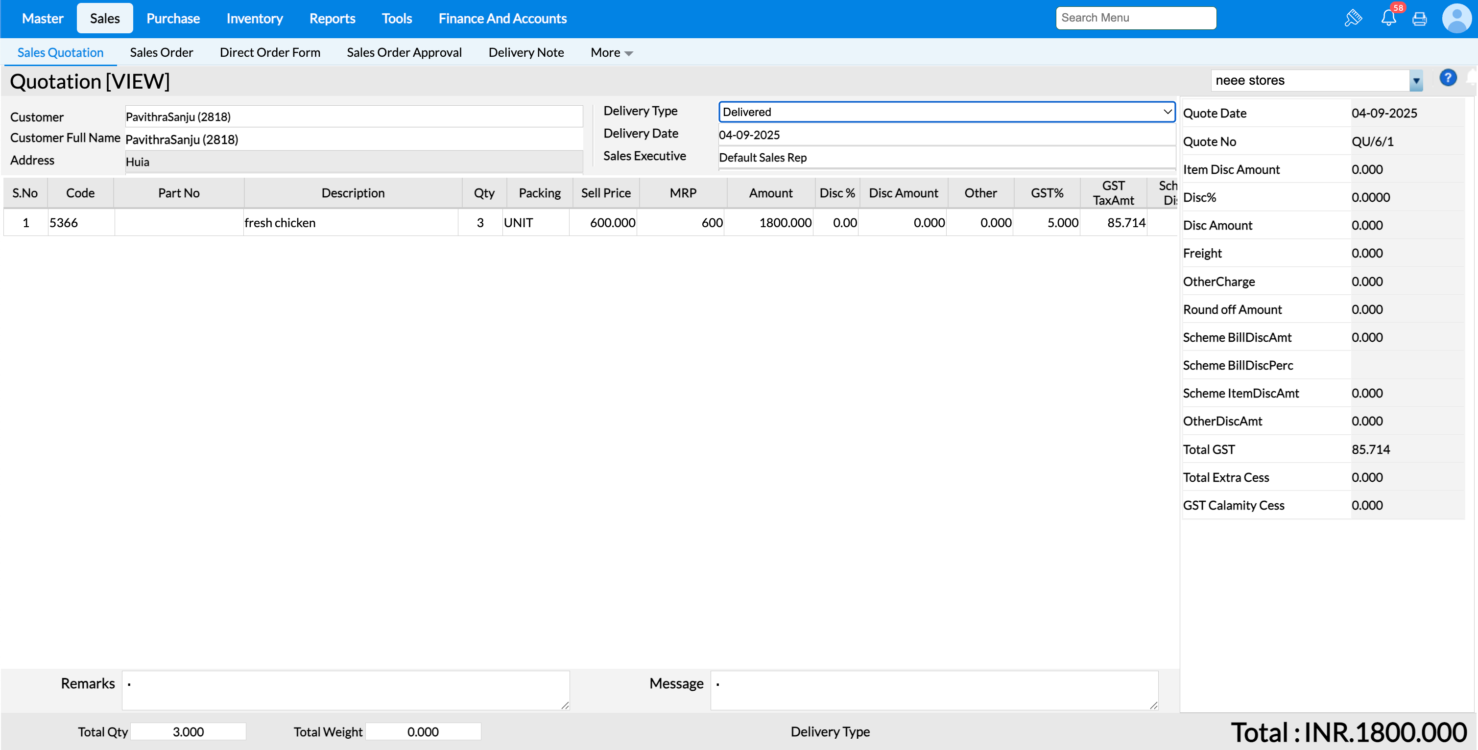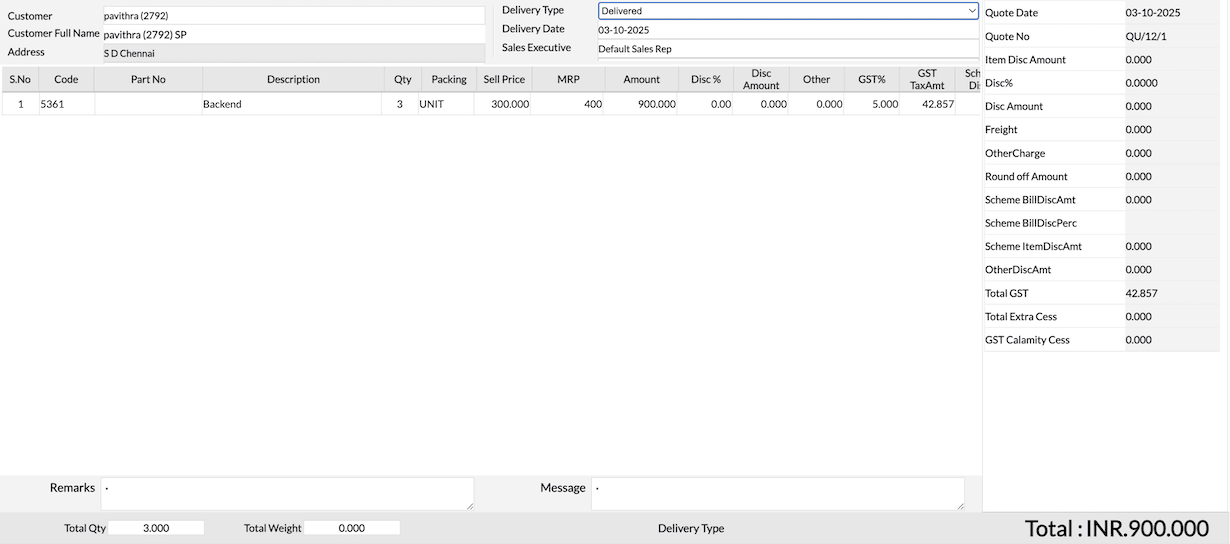 Once the quotation is created, the Delivery Note is generated from the Delivery Branch, and a Sales Bill is created accordingly.