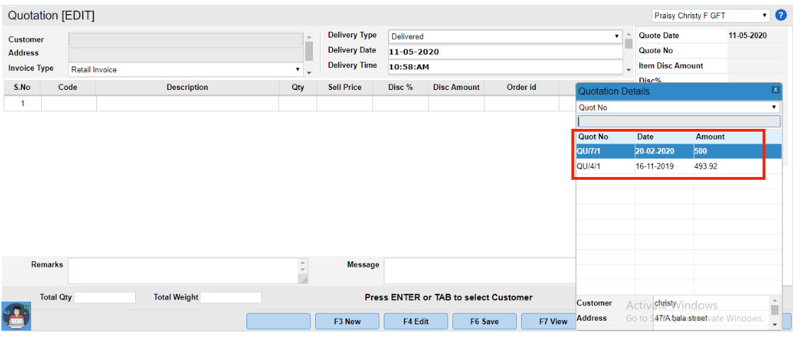 Step 2 : Select the Quotation no to edit