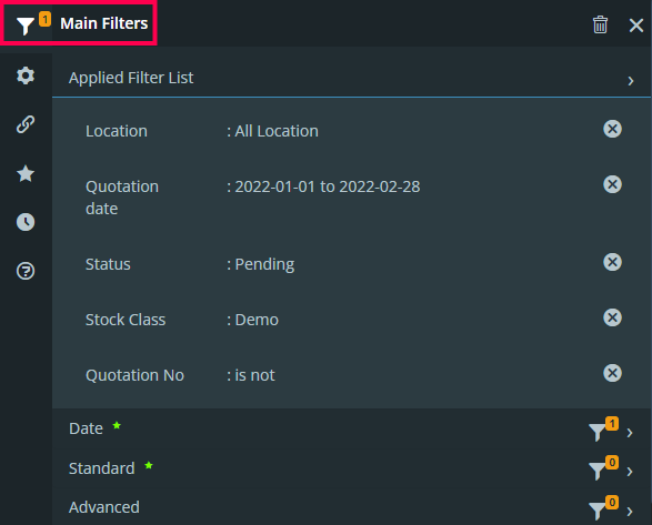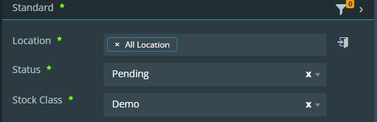 In the Standard section, we can set Location, Status (like pending, delivered, etc.), Stock Class. By default All Locations and All Quotations are selected