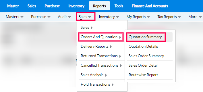 Step 2: From the drop-down of the Sales section, select Orders and Quotation > Quotation Summary