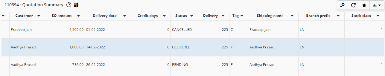 The Sales Quotation Summary report displays the Sales Quotation's header level information like customer names, Quotation amount and status, and provides an overview of the quotation.