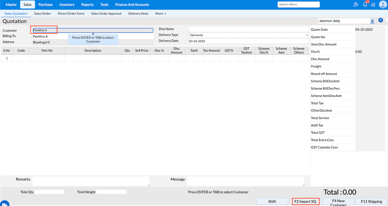 1. Select the Customer and Press Shift + F2 Import SQ option to open the Import SQ option.