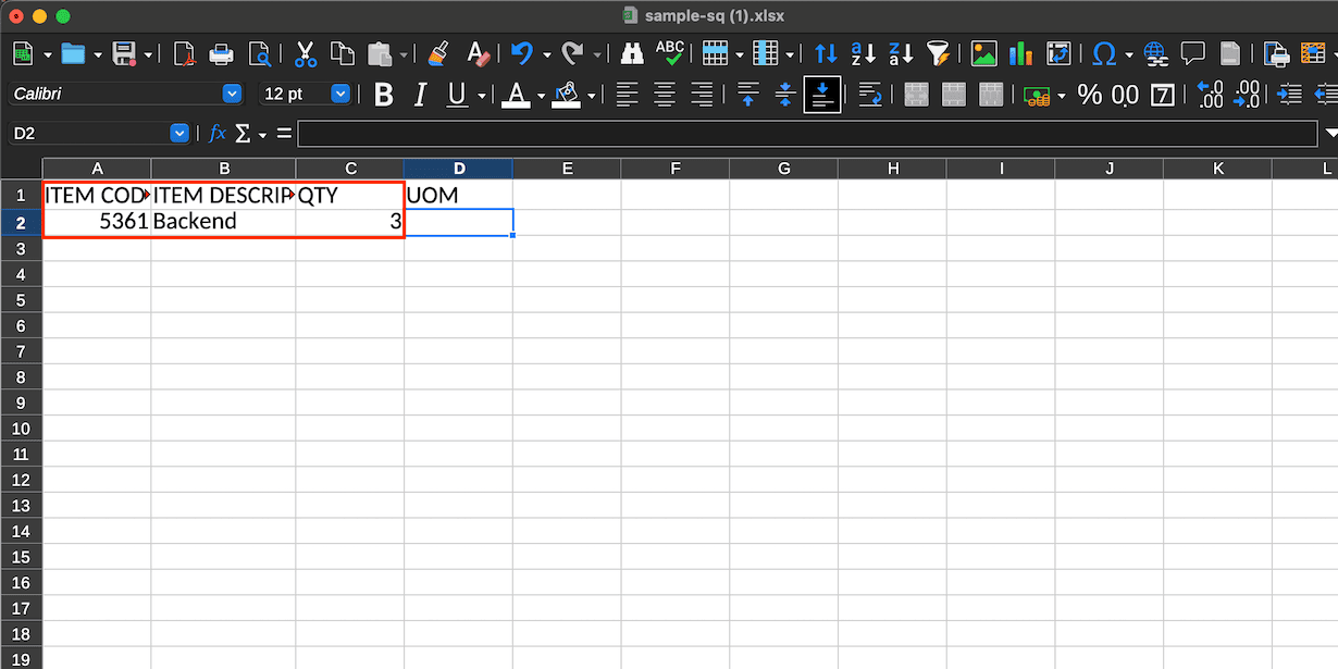 1. Enter the Item Code, Item Description, and Quantity in the sheet.