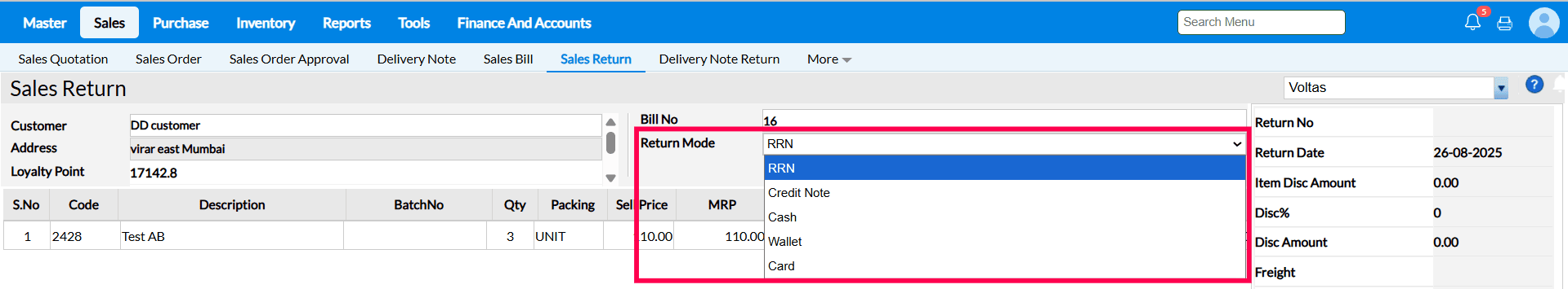 The return screen supports following mode of payment - Cash, credit, card, wallet and RRN