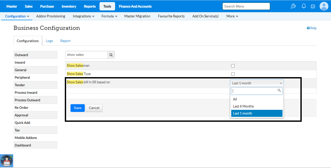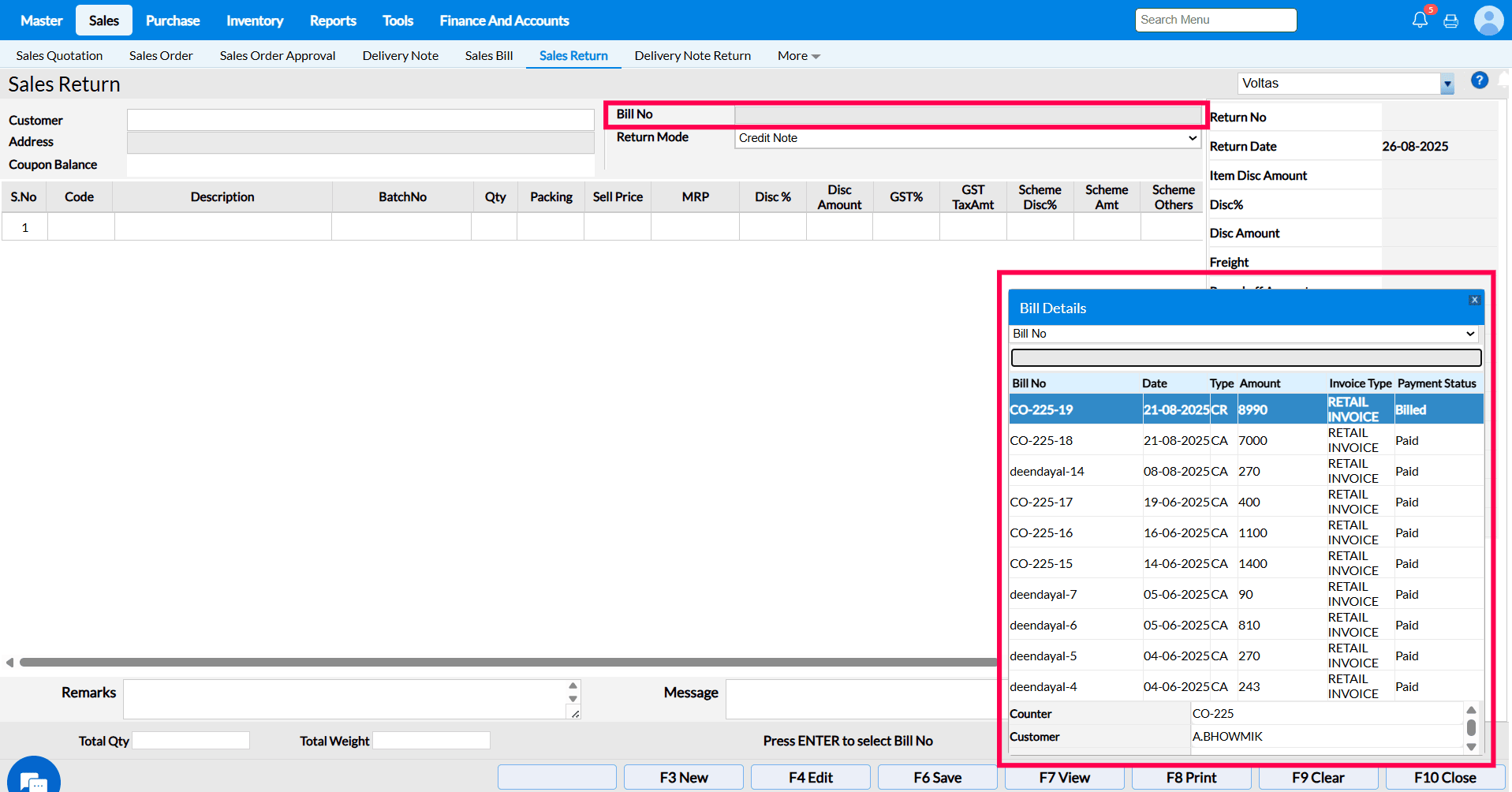 When We are trying to do the sales return based on Bill No configuration, but the sales bill is not showing in the sales return Screen to do the sales return why?