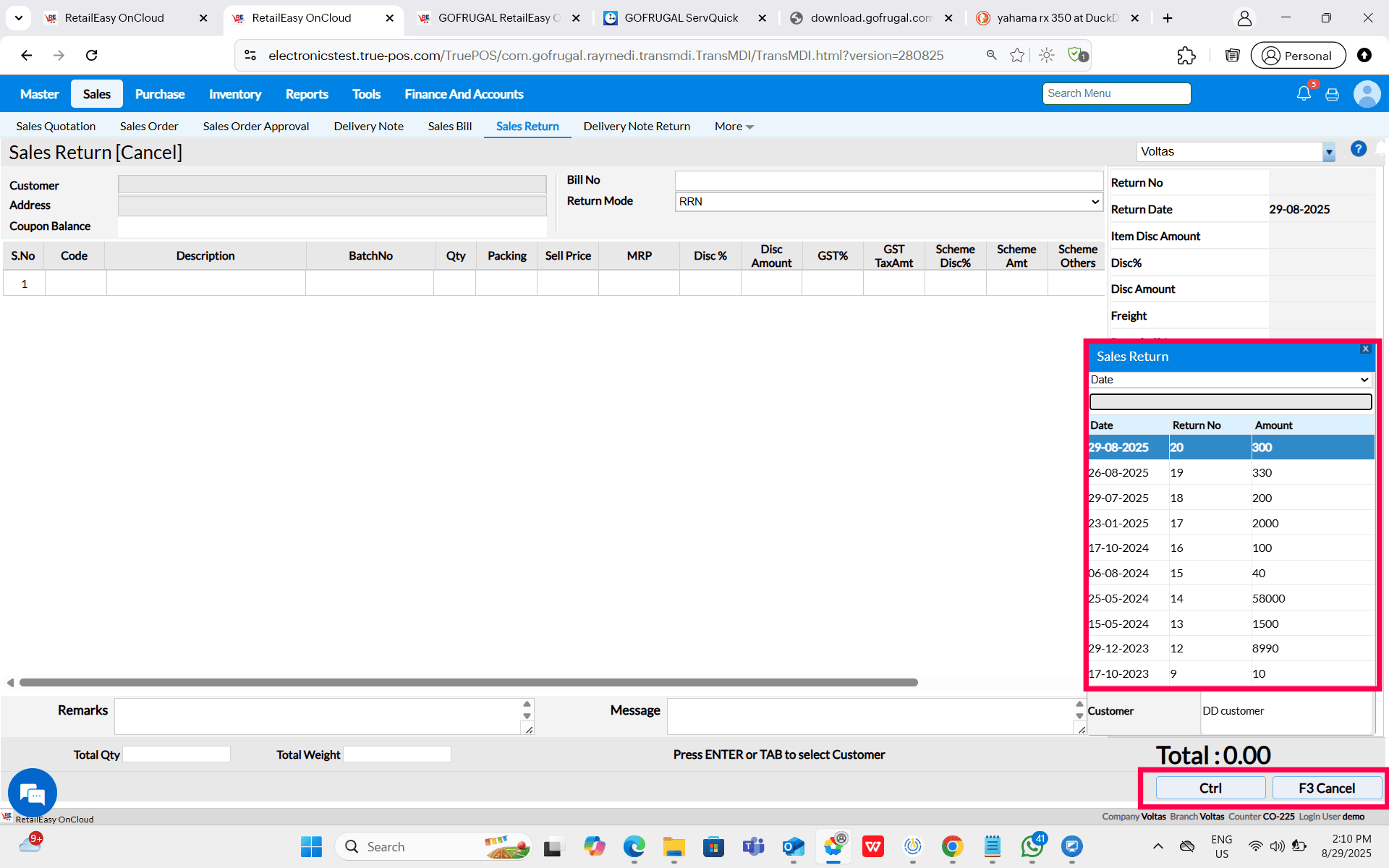 2. Press Ctrl + F3 Cancel key to load the sales return cancel, then the list of sales return will display.