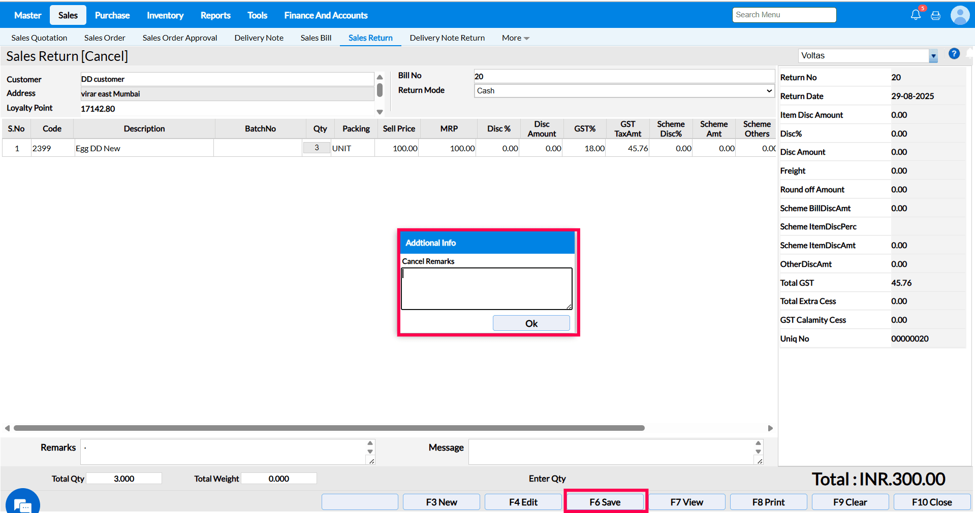 3. Select and load the sales return that you want to cancel. After that, click on save.You will get a popup of remark (Enter the remarks with reason for cancellation ) then click Ok and again Click F6 Save button.