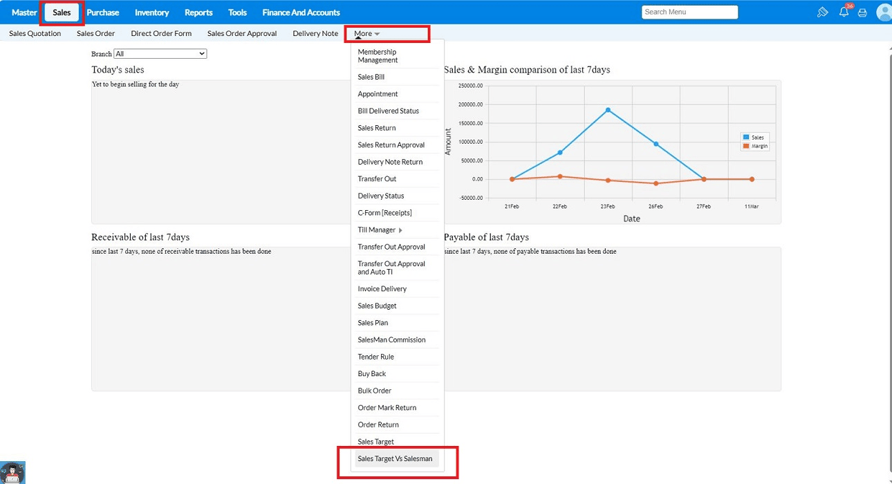 1.Navigate to Sales → More → Sales Target vs Salesman.