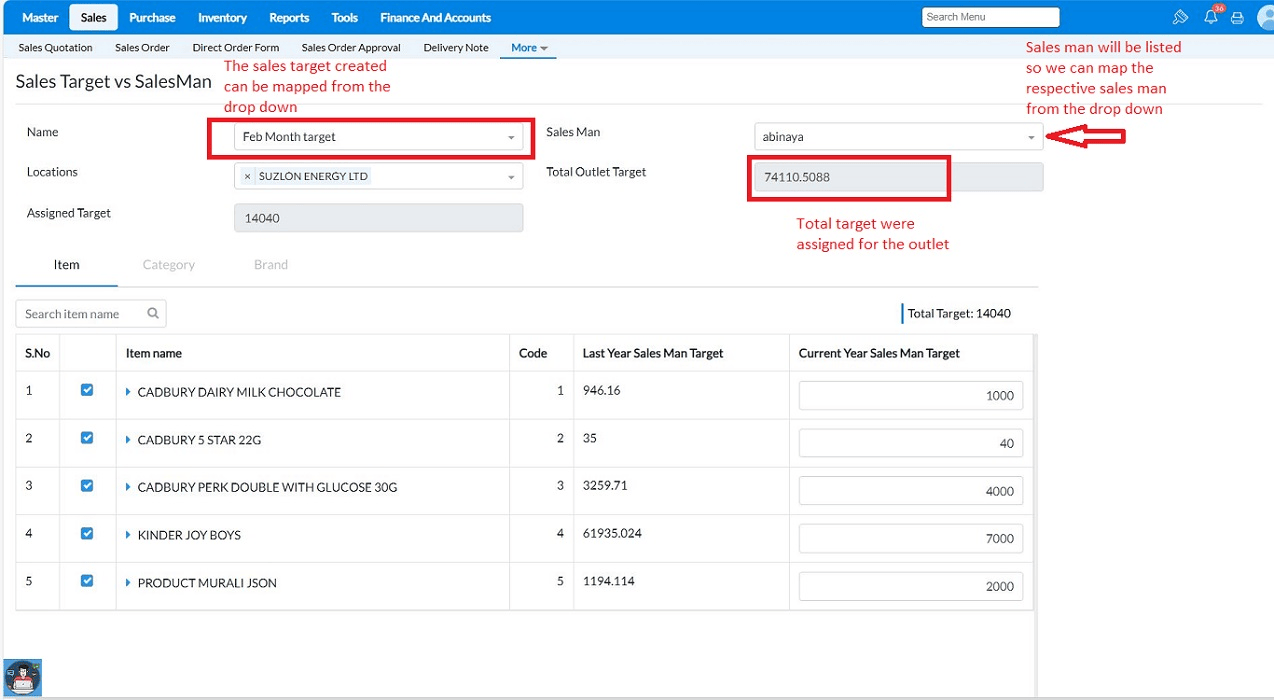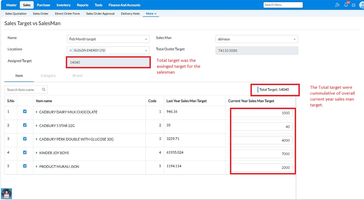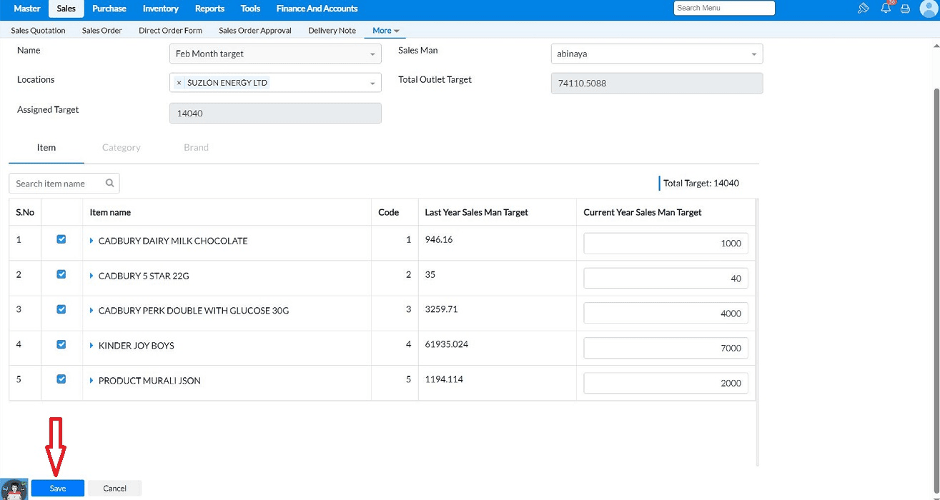 Note: If the sales target was created based on items, the target must be set item-wise. If it was configured based on categories, then the target should be set for category. Here, because the target was created based on items, the options for selecting "category" and "brand" are disabled.