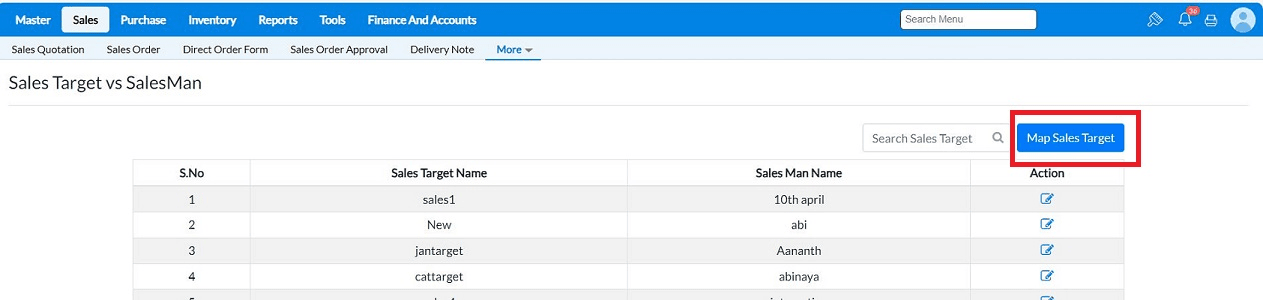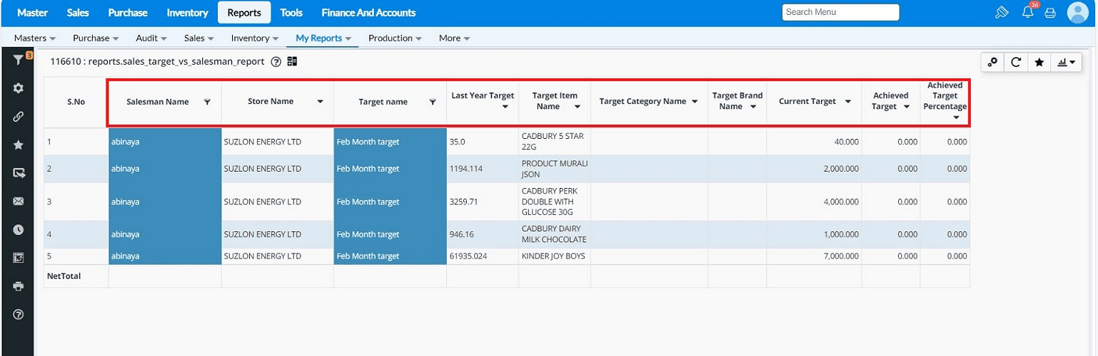 Q1. Once the Sales Target vs. Salesman is saved, where can I verify the Achieved Target details? You can verify the complete details in Reports → My Report →Sales Target Vs Sales man report.