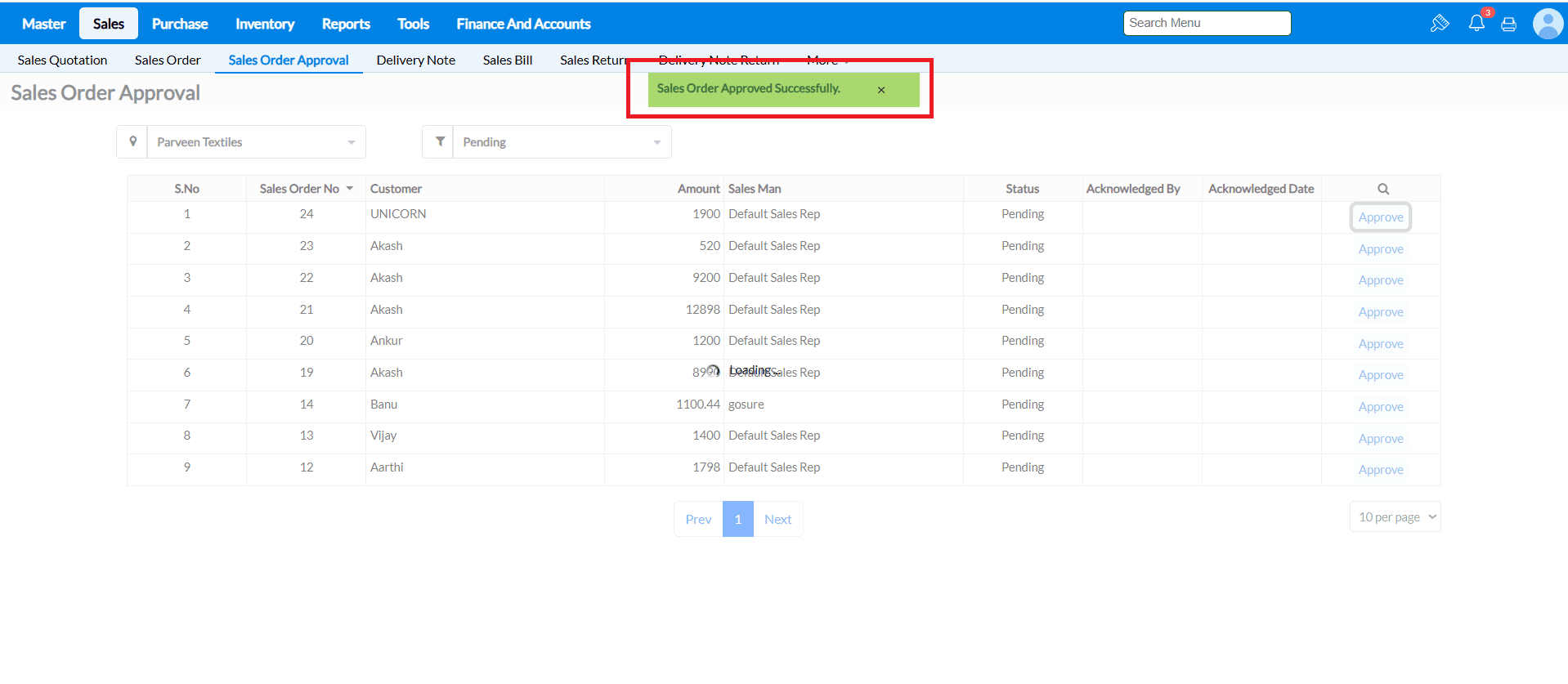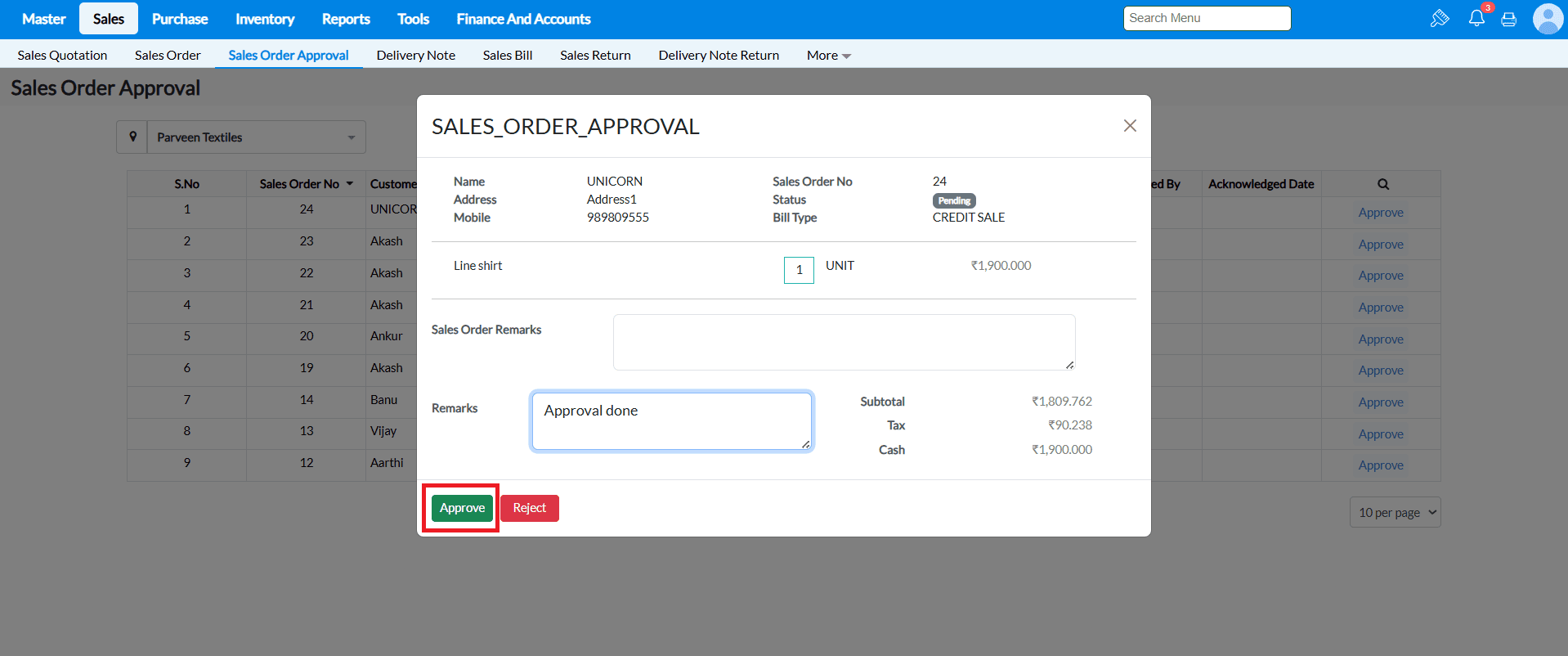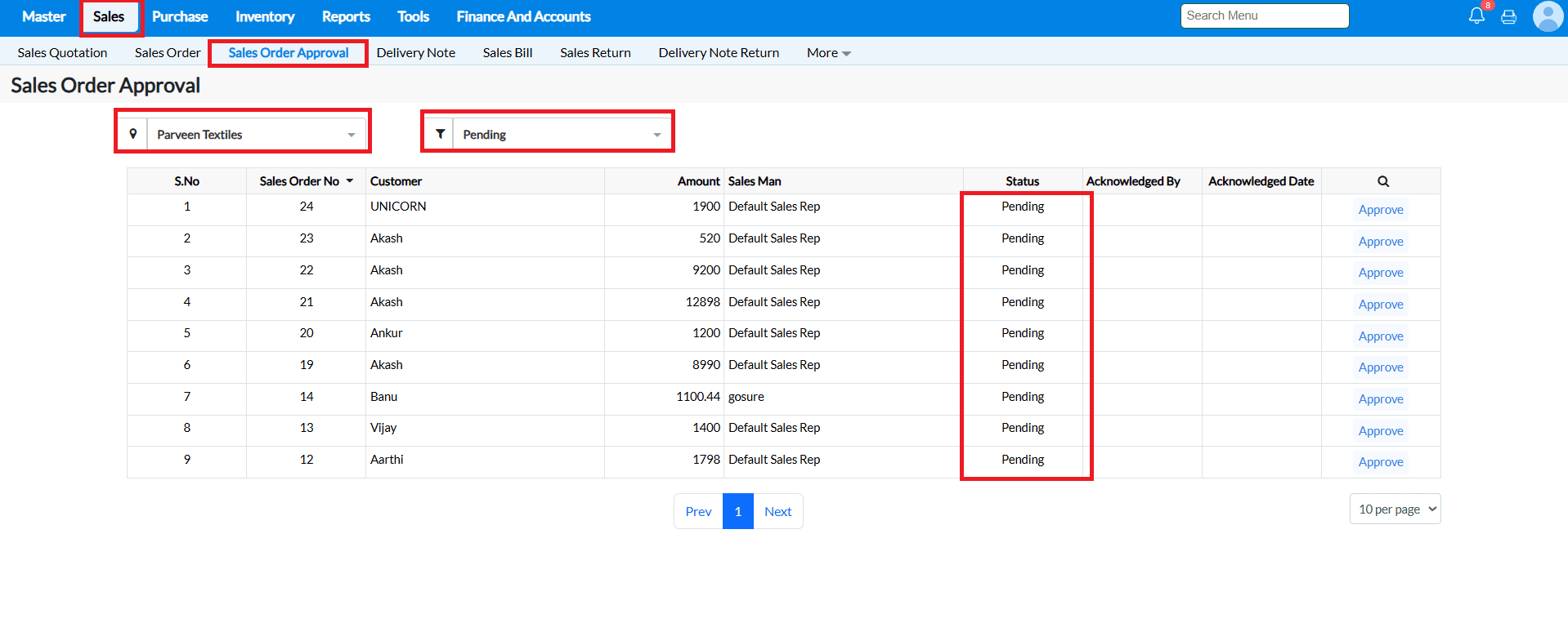 2. Go to the Sales order approval screen after creating your sales order. You'll receive a list of each order placed by the user.