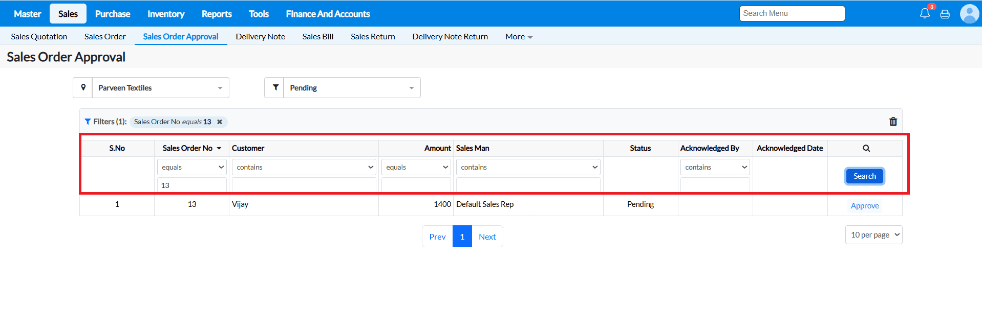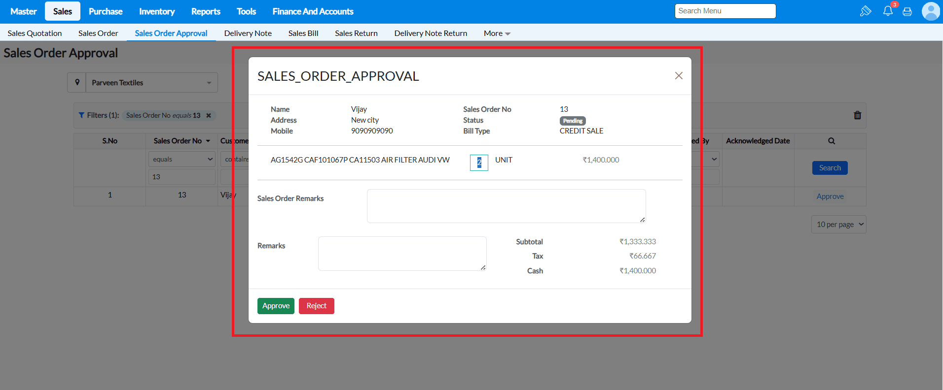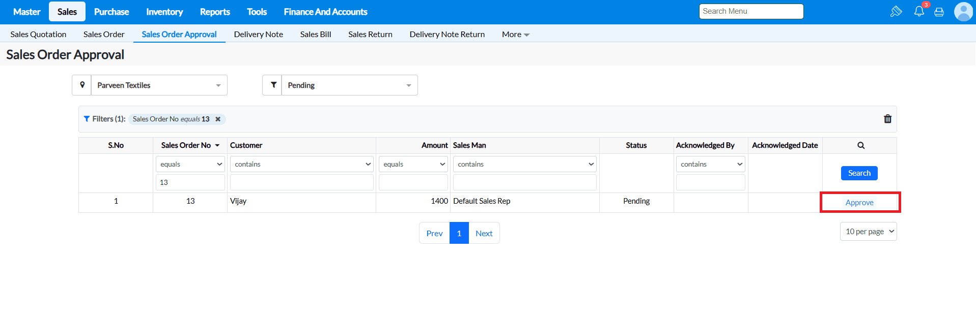 2. Go to the Sales order approval screen after creating your sales order. You'll receive a list of each order placed by the user.