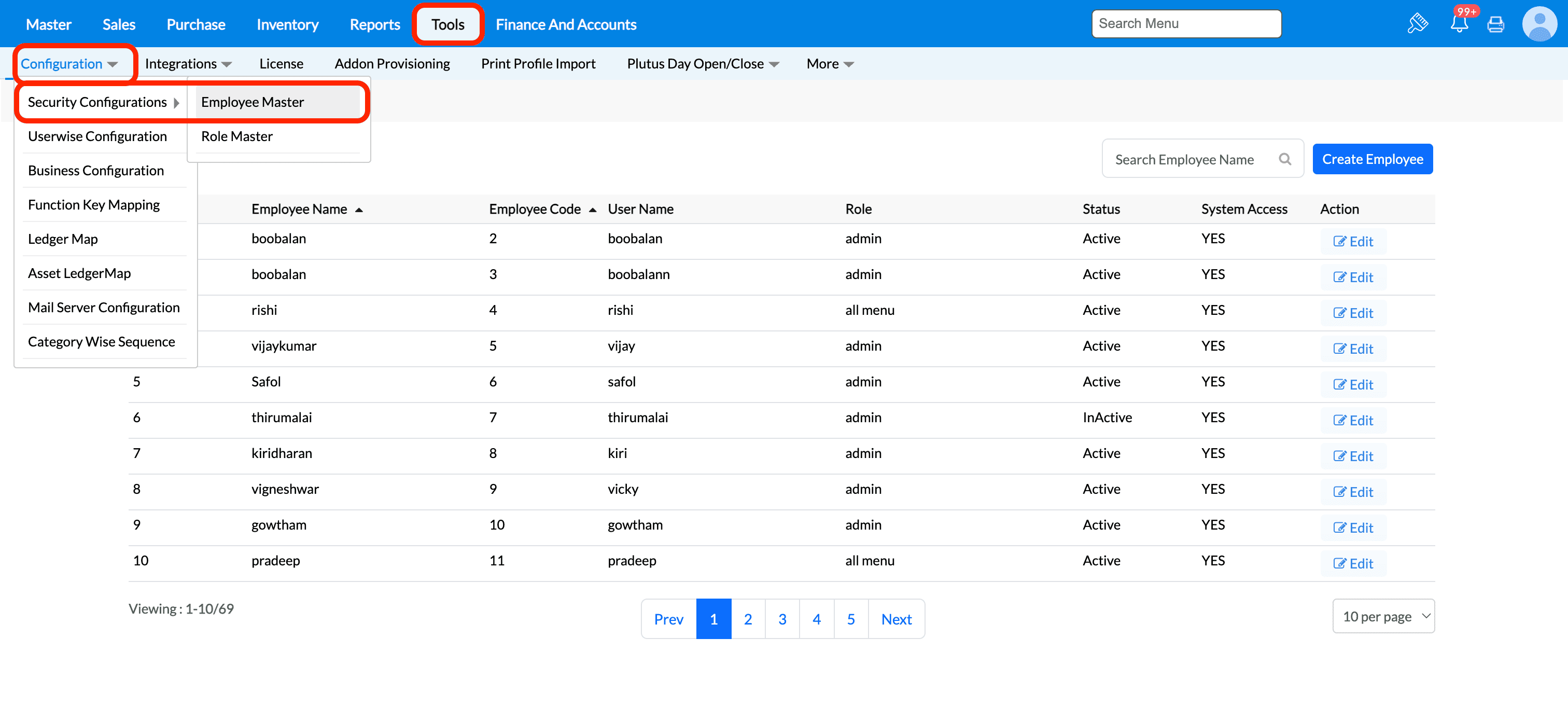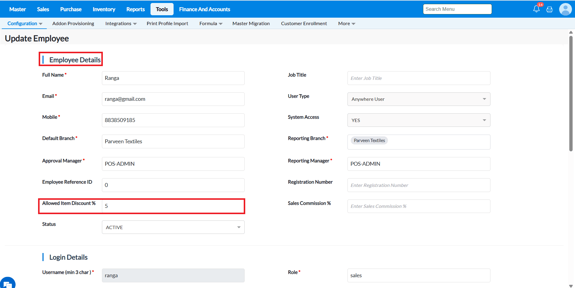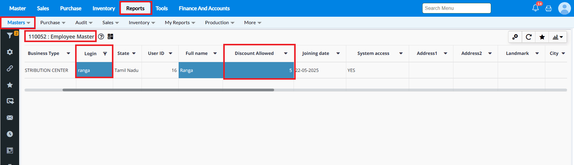 Alternatively, navigate to Reports → Master → Employee Master Reports, where you can verify the value under the Discount Allowed column.