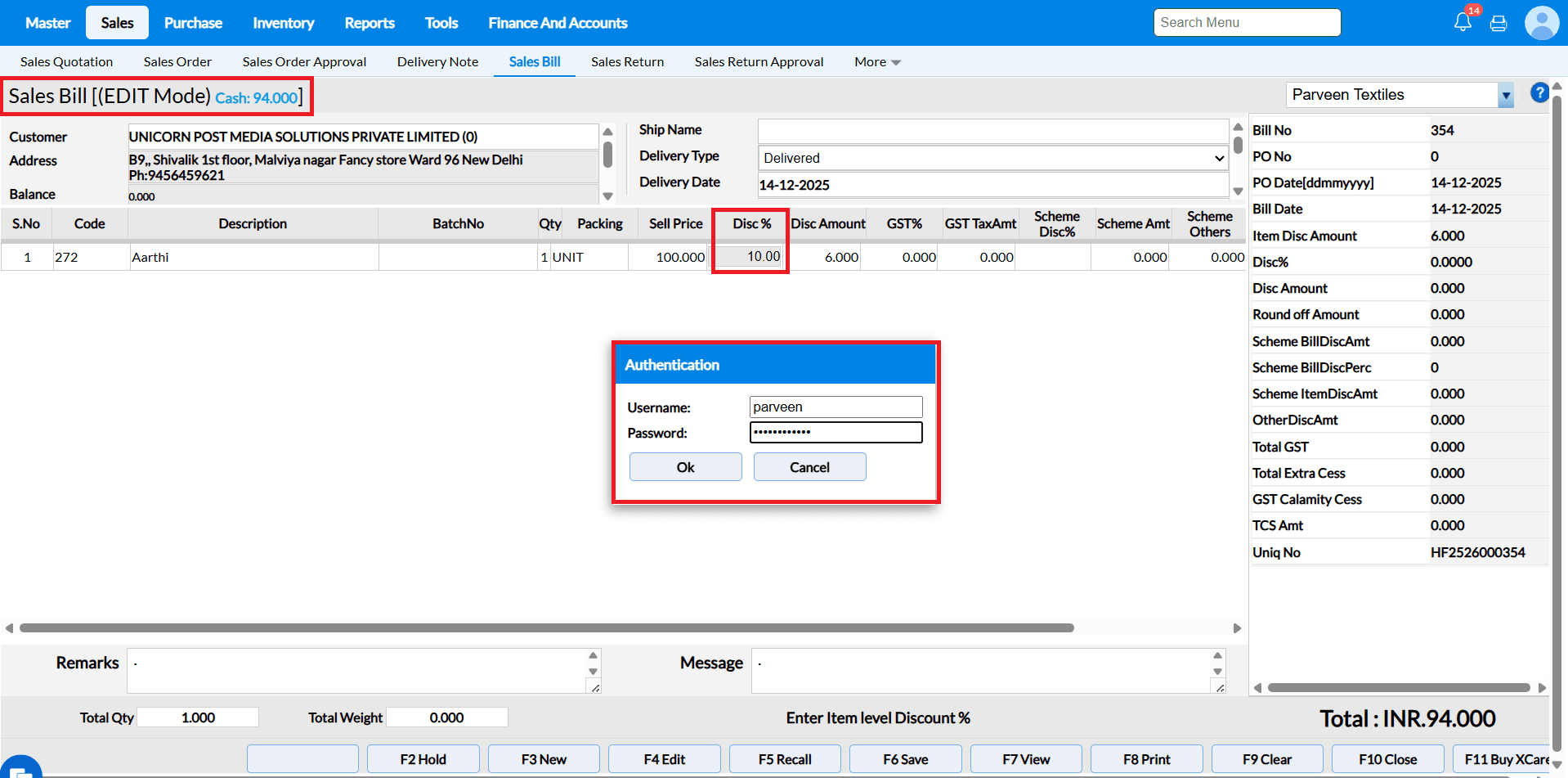 where approval manager /another employee who has a higher discount limit has to enter their login details and then only it will allow to save the bill.