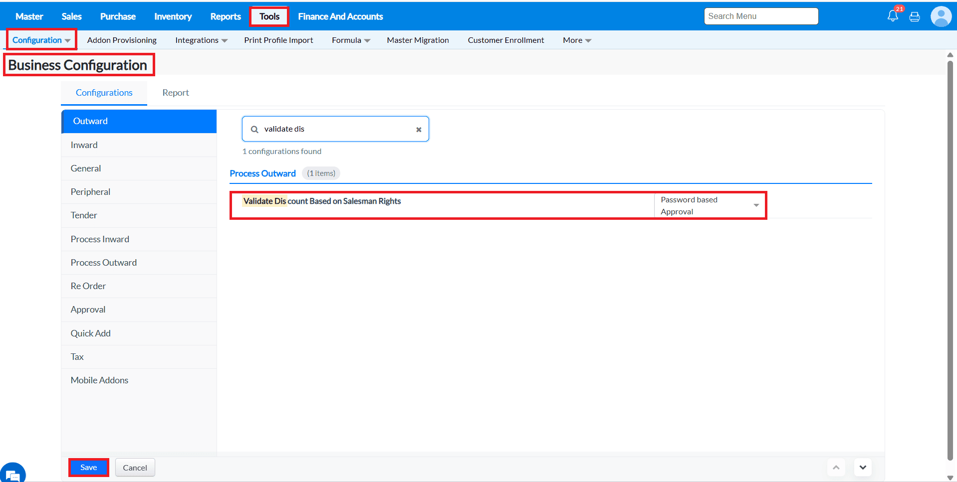 From the Dashboard, navigate to Tools → Configuration → Business Configuration, and enable “Validate Discount based on Salesman Access Rights to be Password Based Approval.”