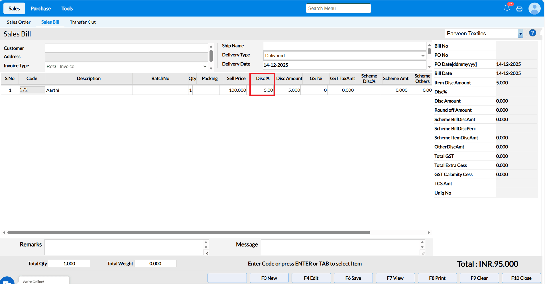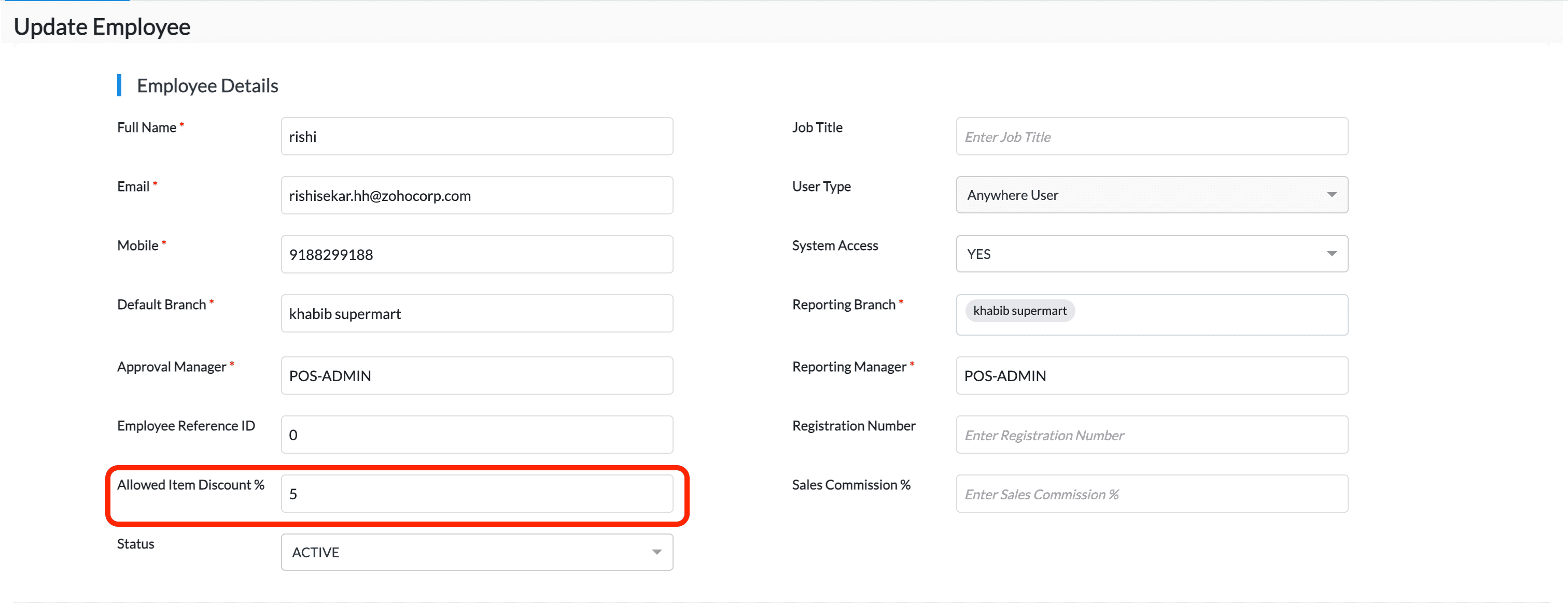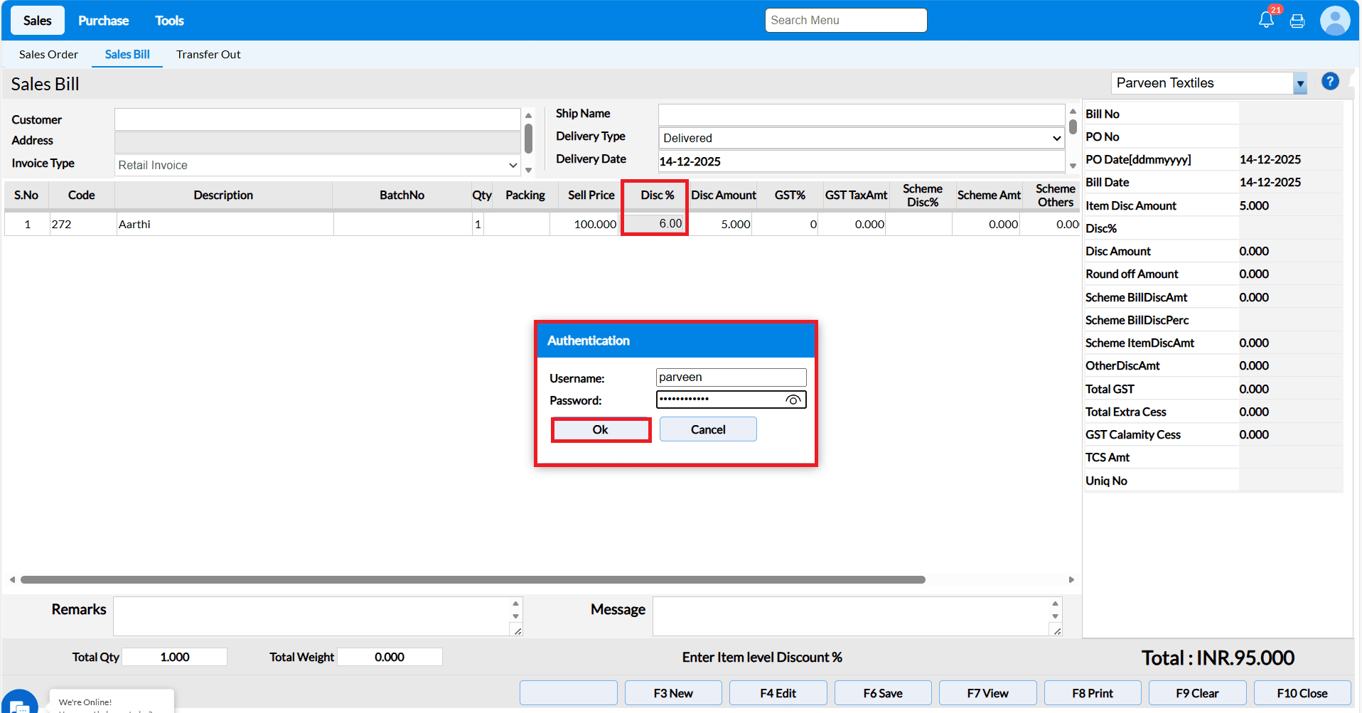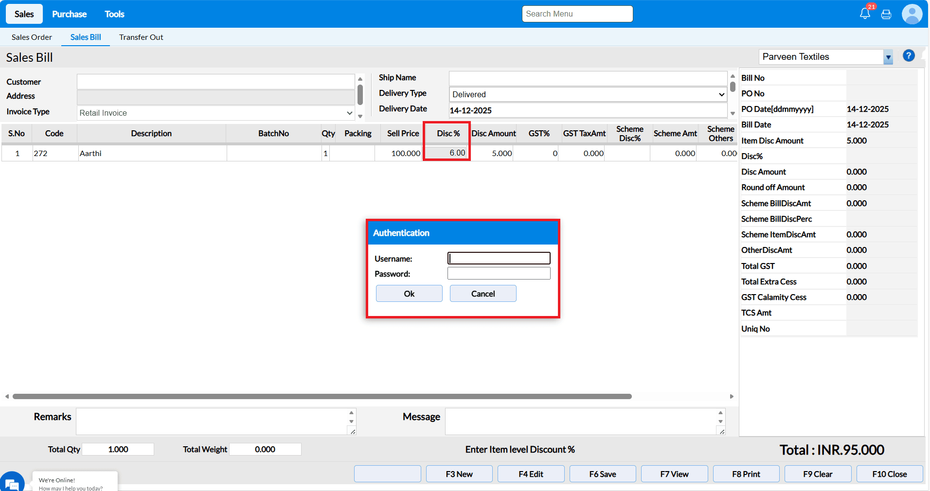 Example: If a user is created with the allowed item discount % as '5', in sales bill he will be allowed to give maximum of 5% discount to each item, if he tries to give 6% system will prompt and it will not allow.