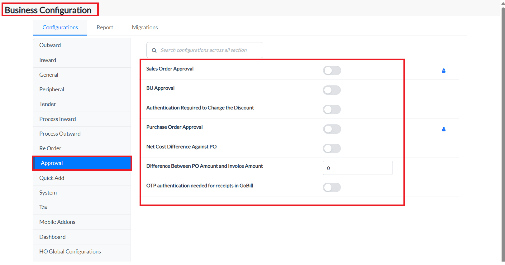 2. Under the Business Configurations, click on the Approval tab and all the configurations under this tab will be listed.