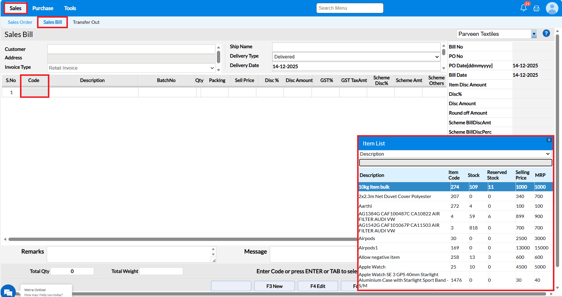 Go to sales -> sales bill, Press 'Enter' and select the 'Item' from the LOV.