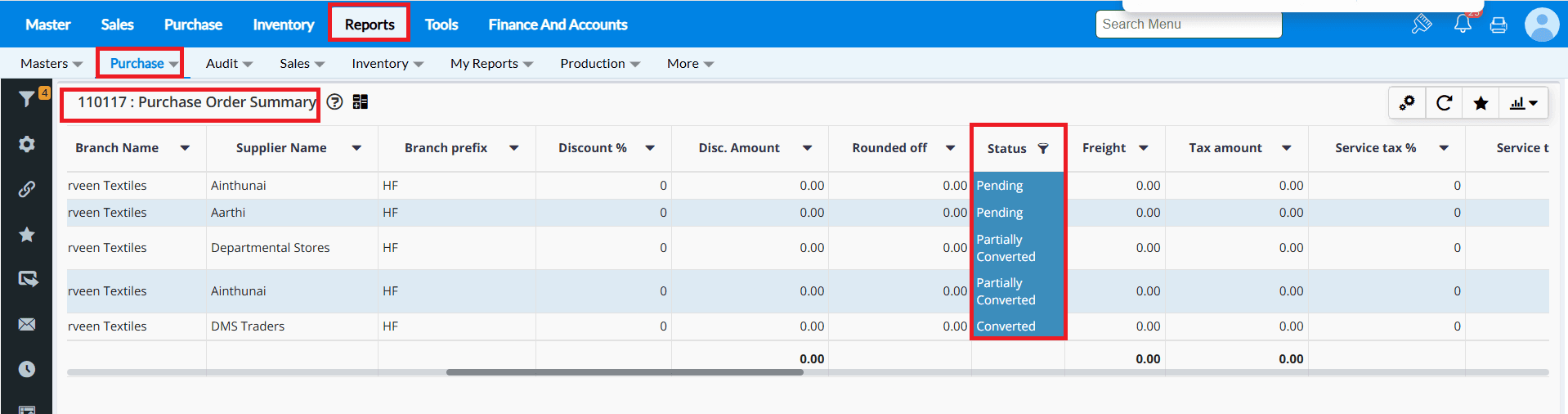 Ans:A purchase order will be displayed only if it has been approved by the admin. If it is still in pending status, it will not appear in the purchase invoice when you try to convert it into a purchase invoice using Load PO function key.