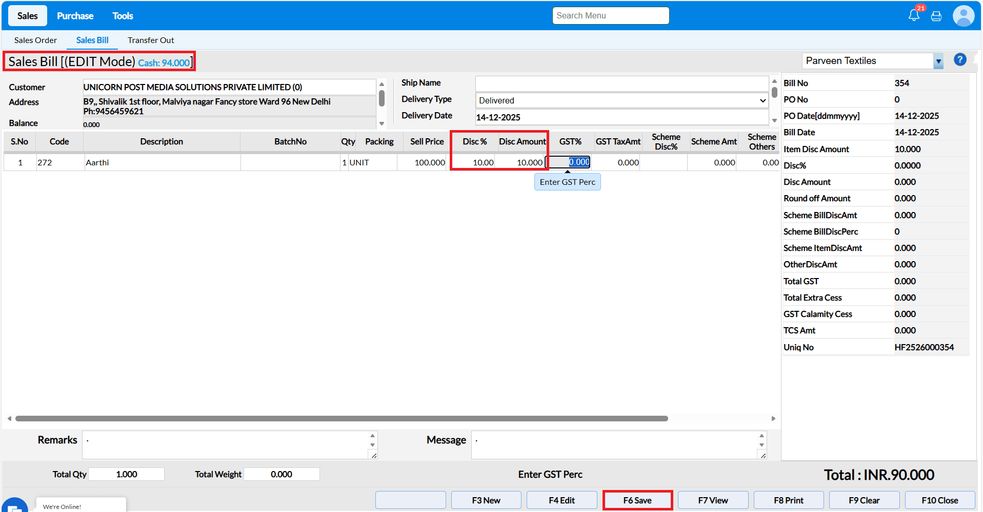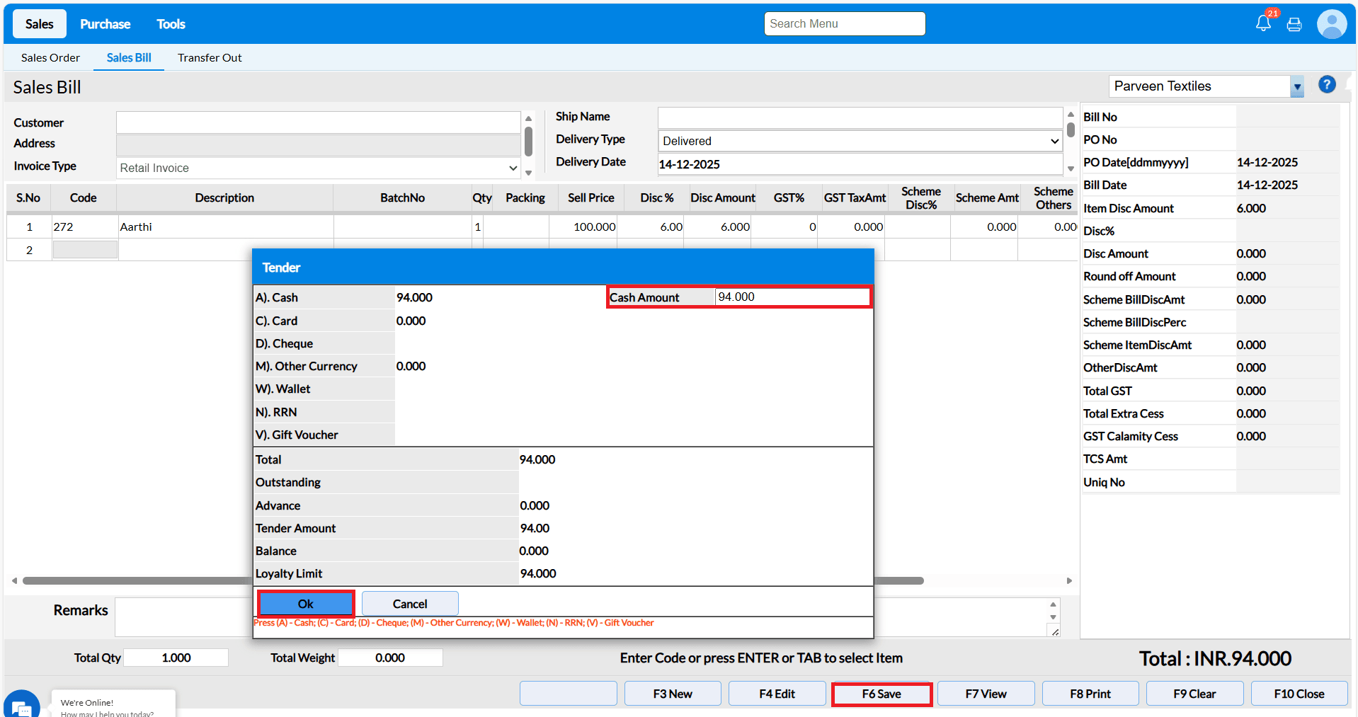 Click on Save button , enter the values in tender pop and select ok to save the bill.