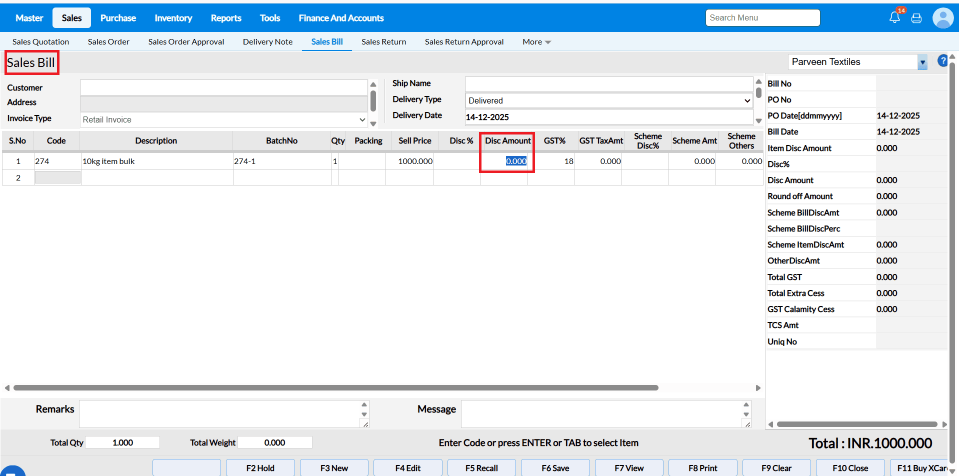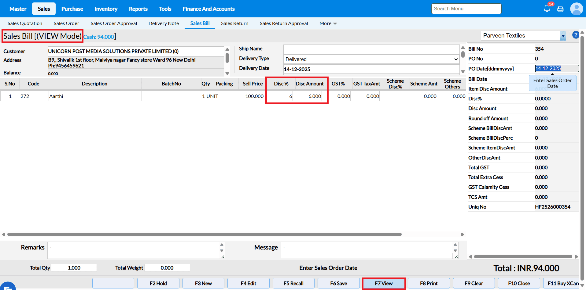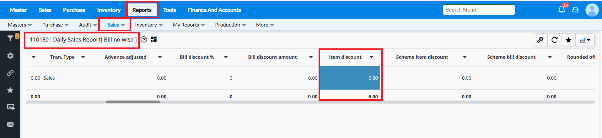 Alternatively, navigate to Reports → Sales → Sales → Daily Sales Bill No-wise Report, where the discount value can be viewed under the Item Discount column.