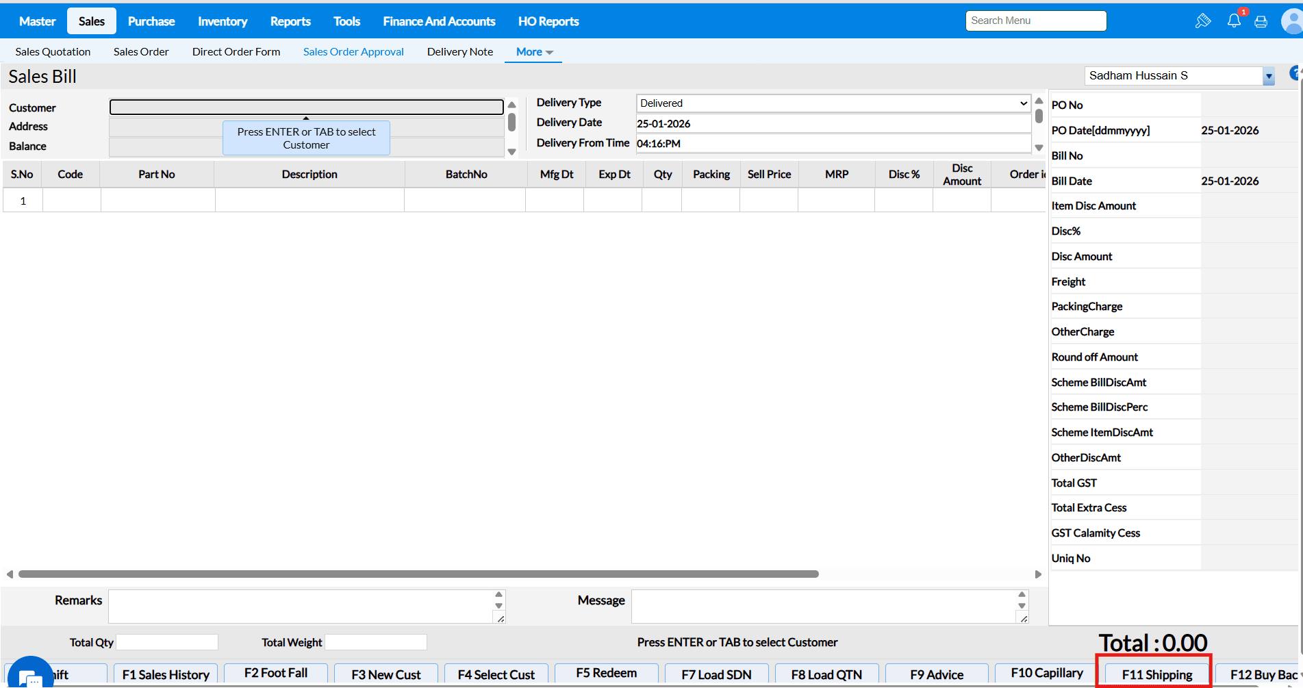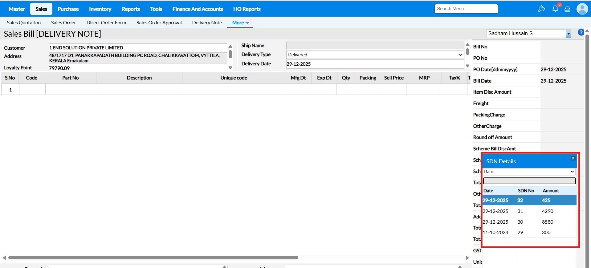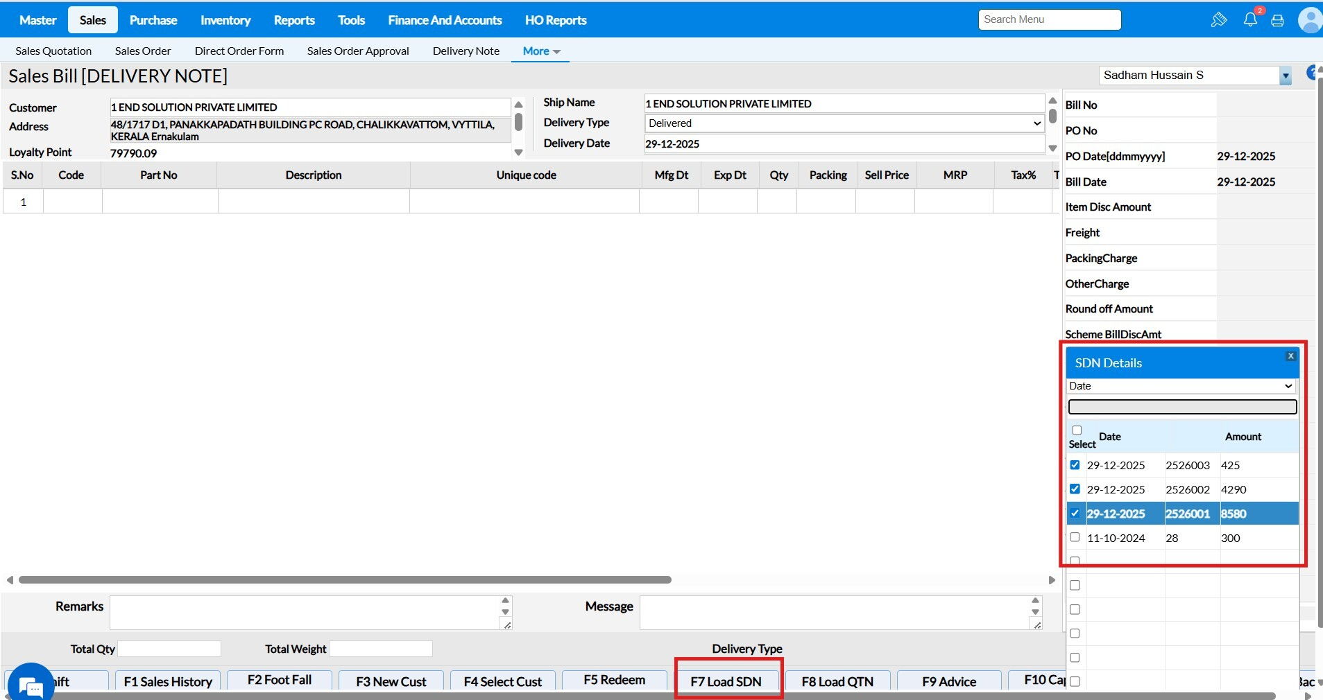 3. Press 'Shift+F7' to load the SDN, it will list the respective DN of the selected customer and select the multiple Delivery Note which to be convert as Sales Bill and press enter.