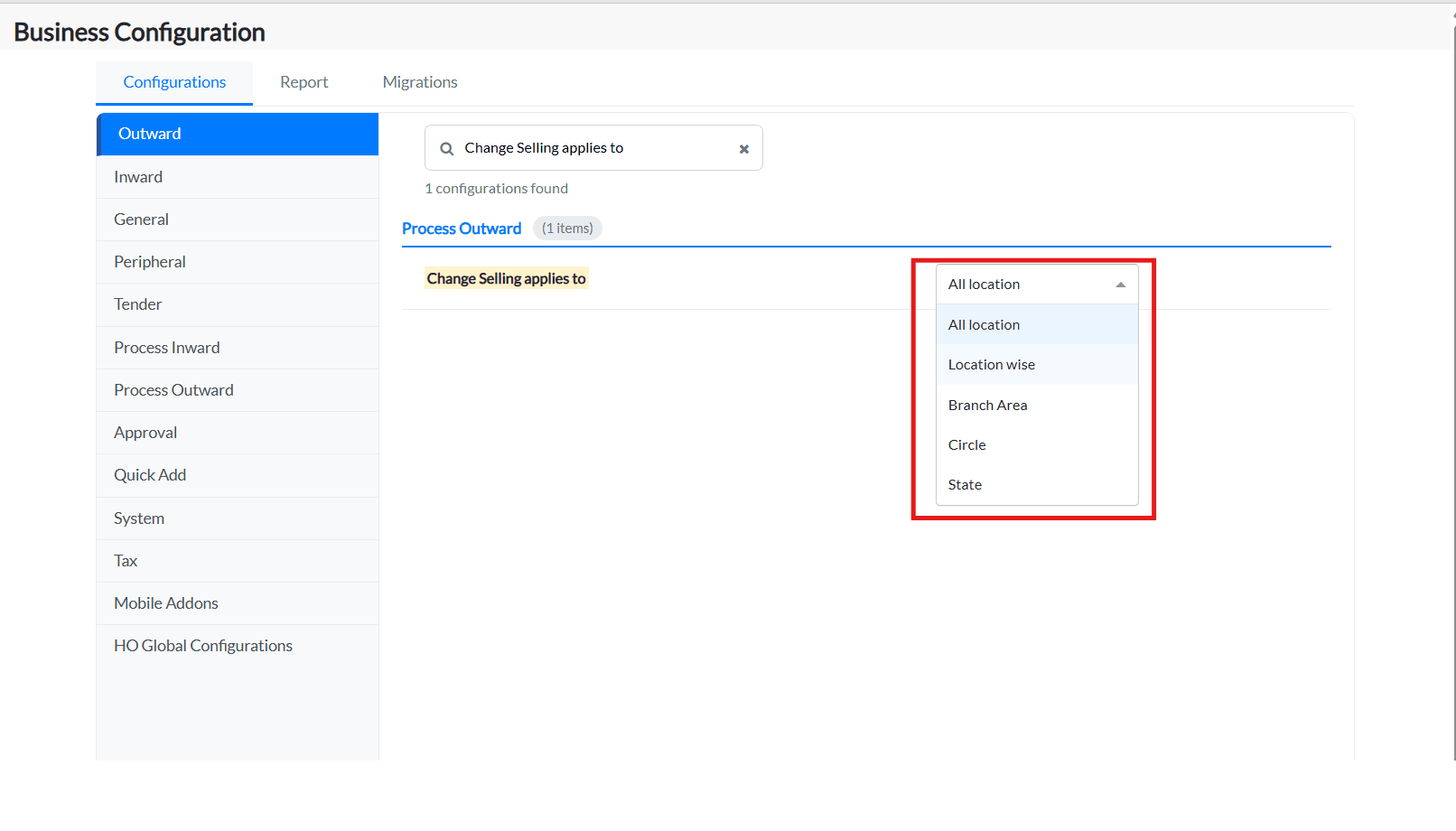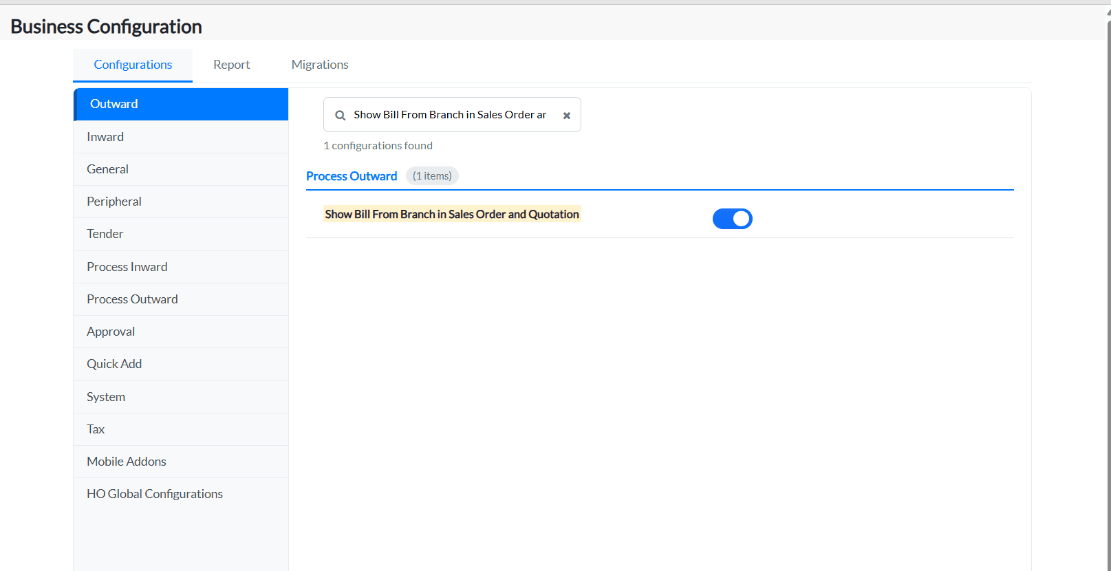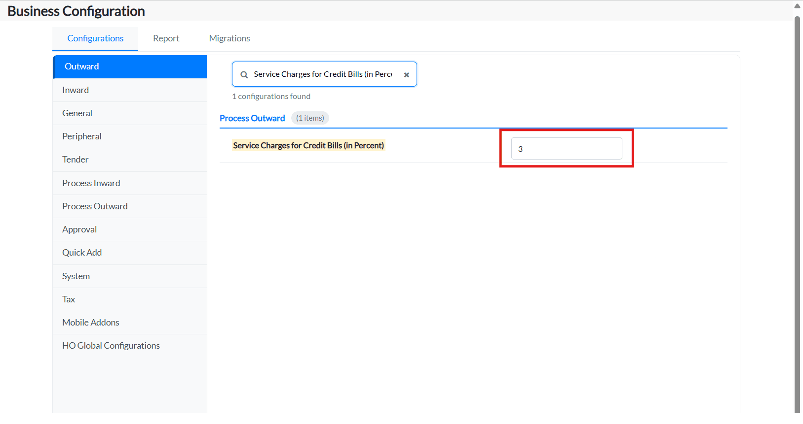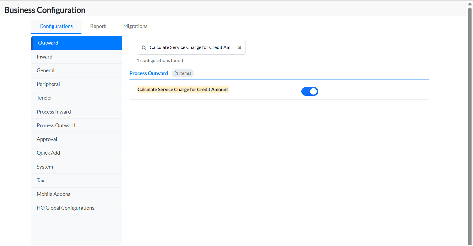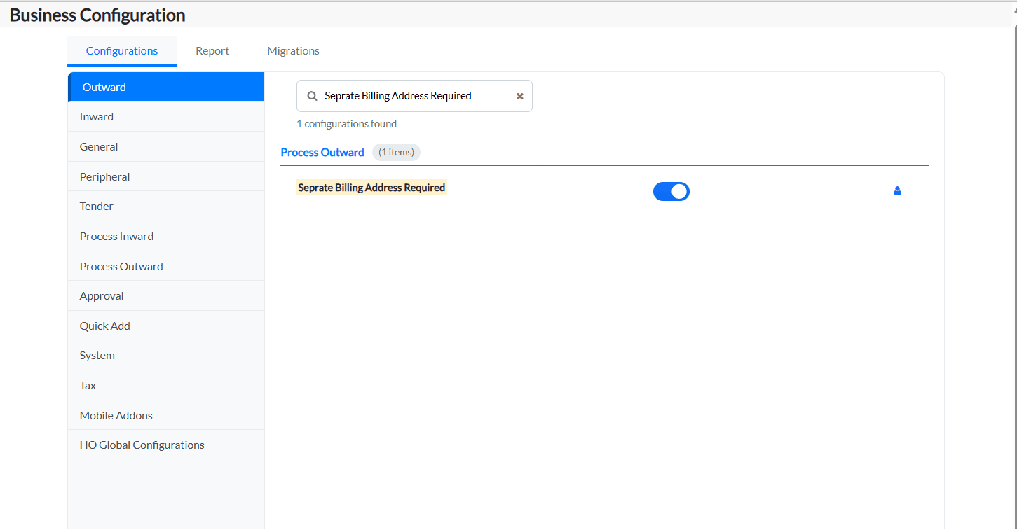 2. Under the Configurations tab, click on the Process Outward tab and all the configurations under this tab will be listed.